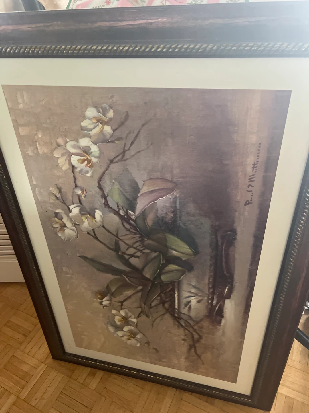 This framed painting features a delicate orchid motif. The artwork is housed in a dark, ornate frame. Dimensions are approximately 28 x 40 inches.