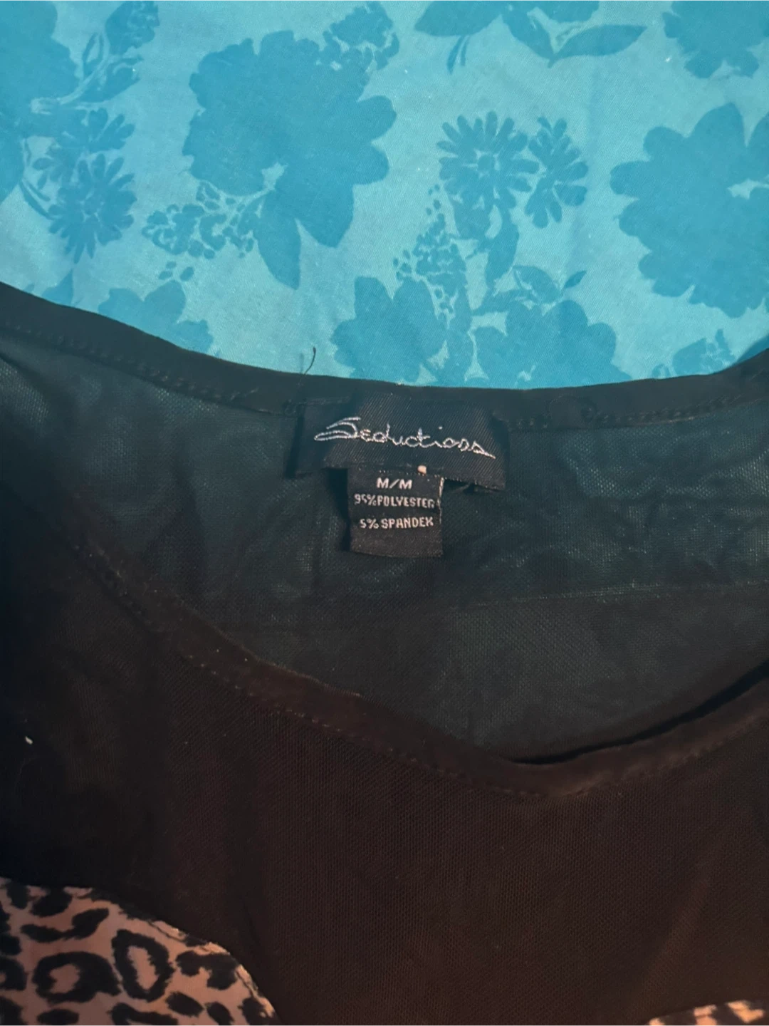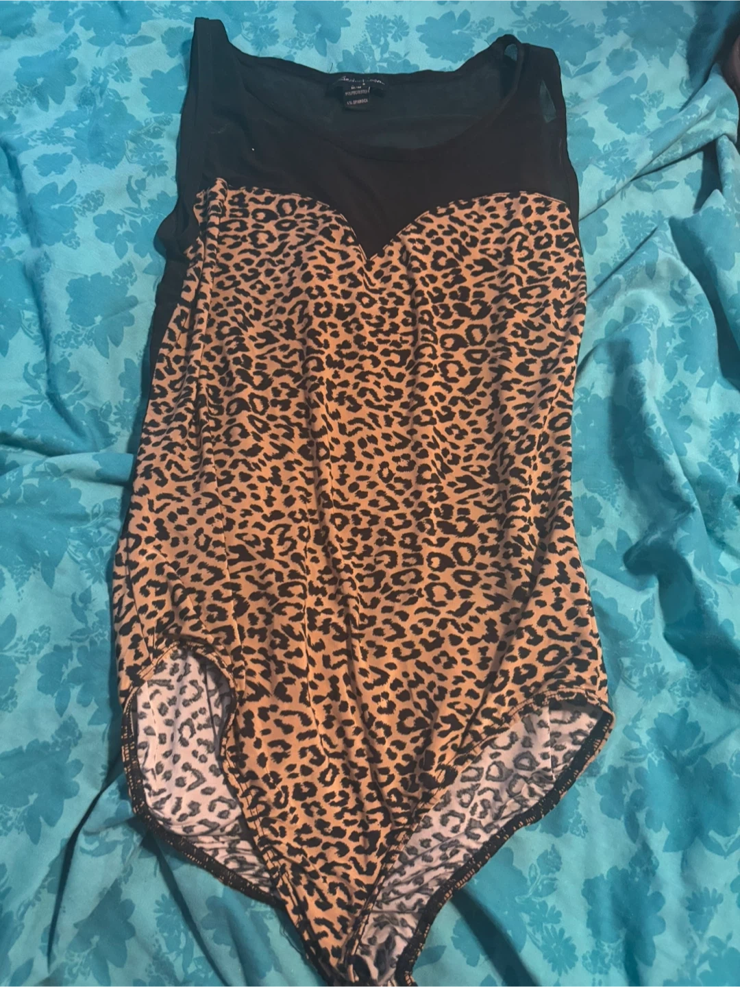 Cute Seductionss bodysuit with a fun leopard print! The top part is a sheer black mesh. It's a size M/M and made of 95% polyester and 5% spandex