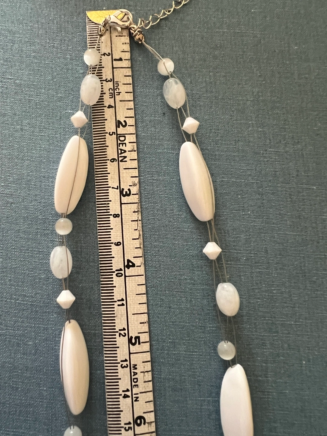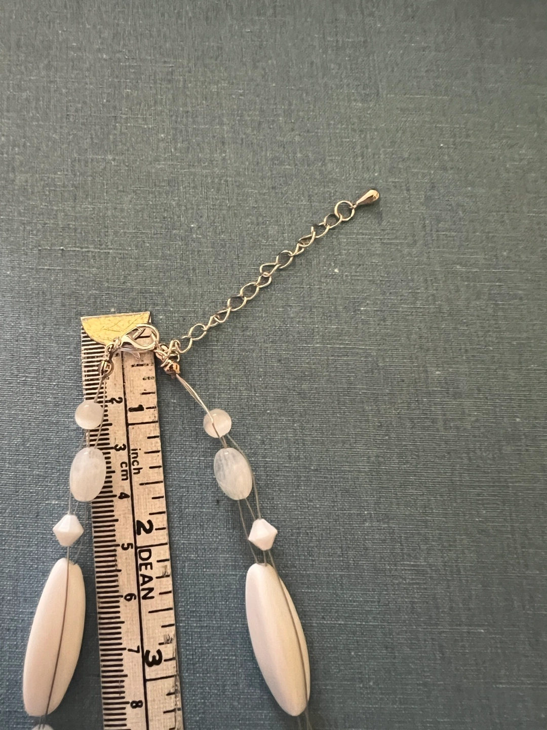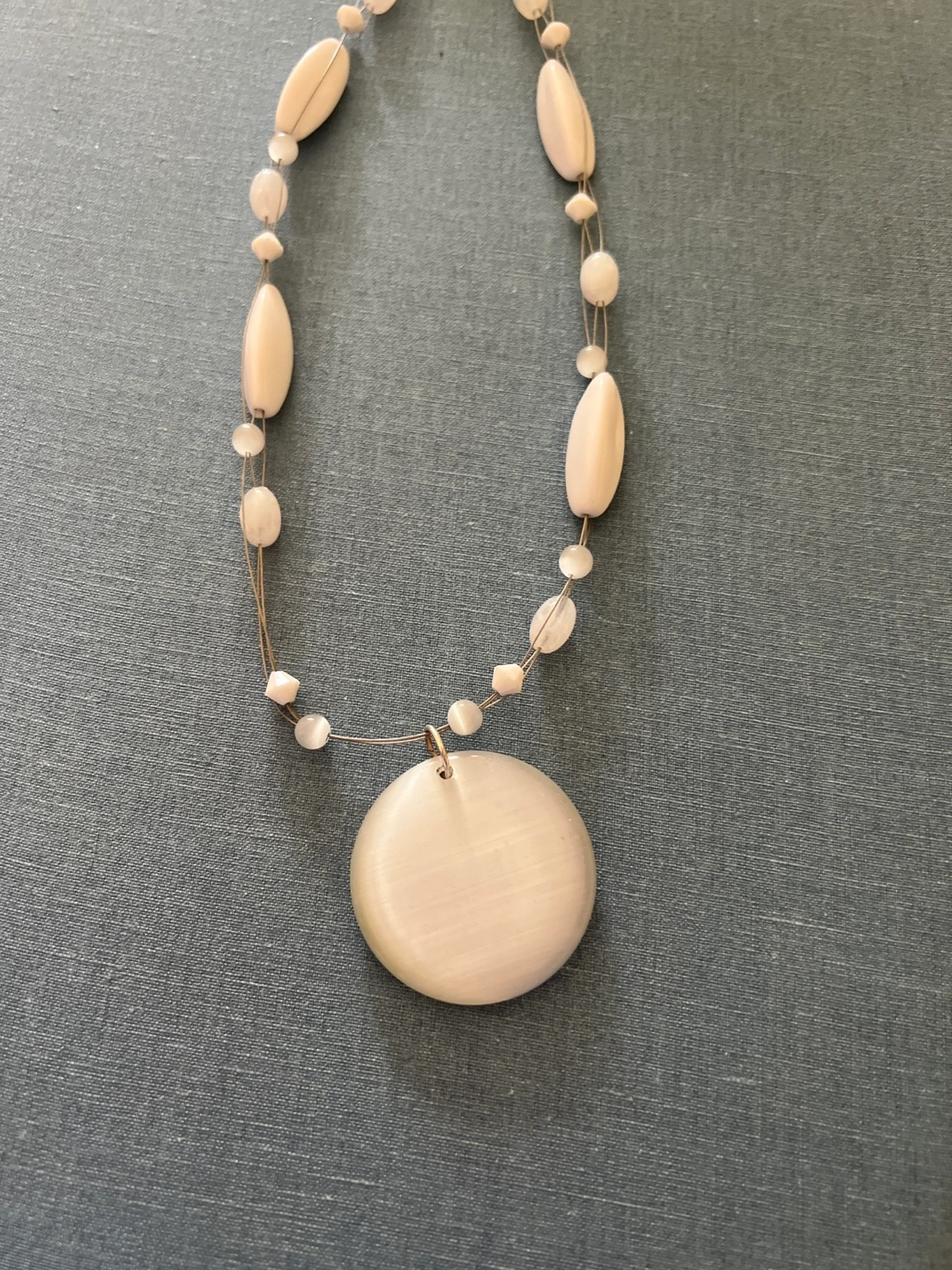 Charming necklace in off-white, with a variety of shaped beads. The necklace features an attached pendant at the bottom. You could wear this with a beautiful dress or a simple top to elevate your look.