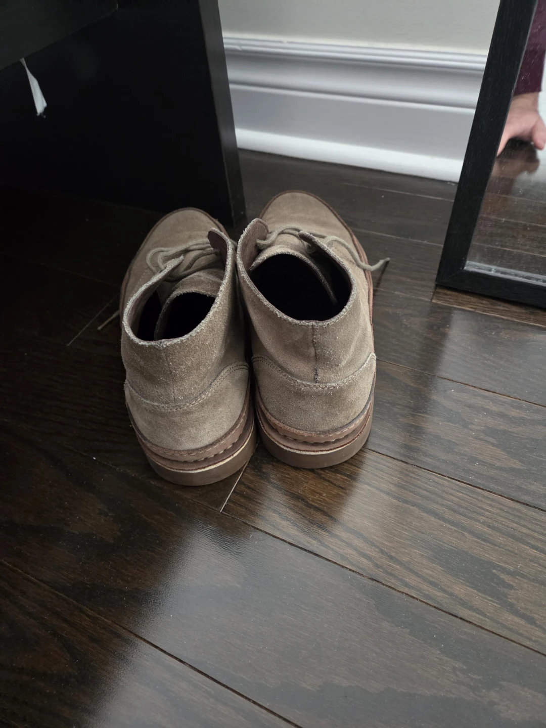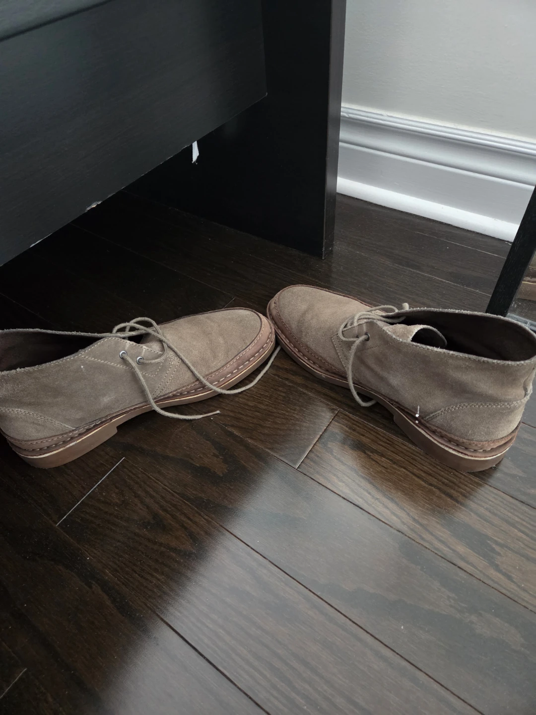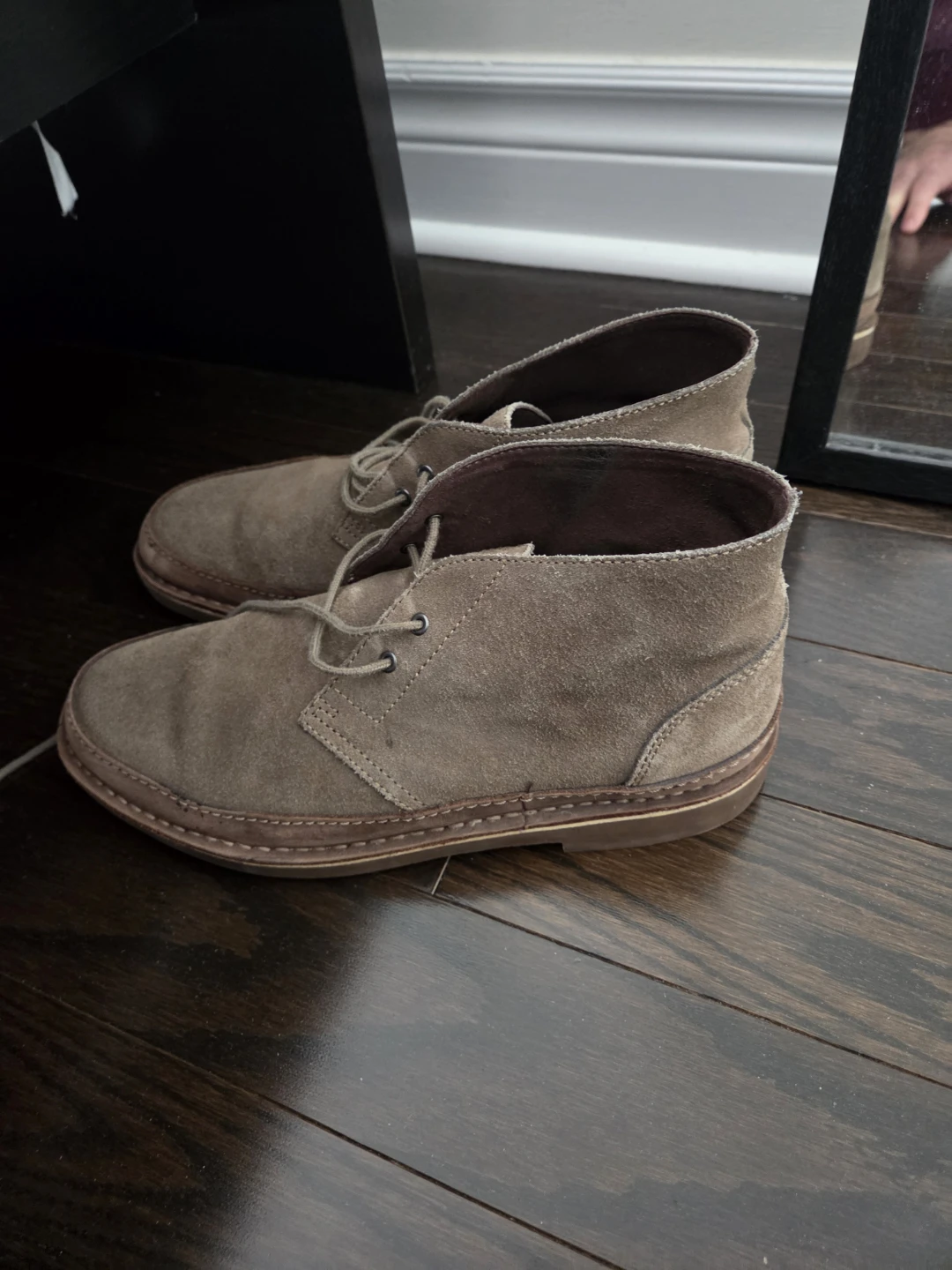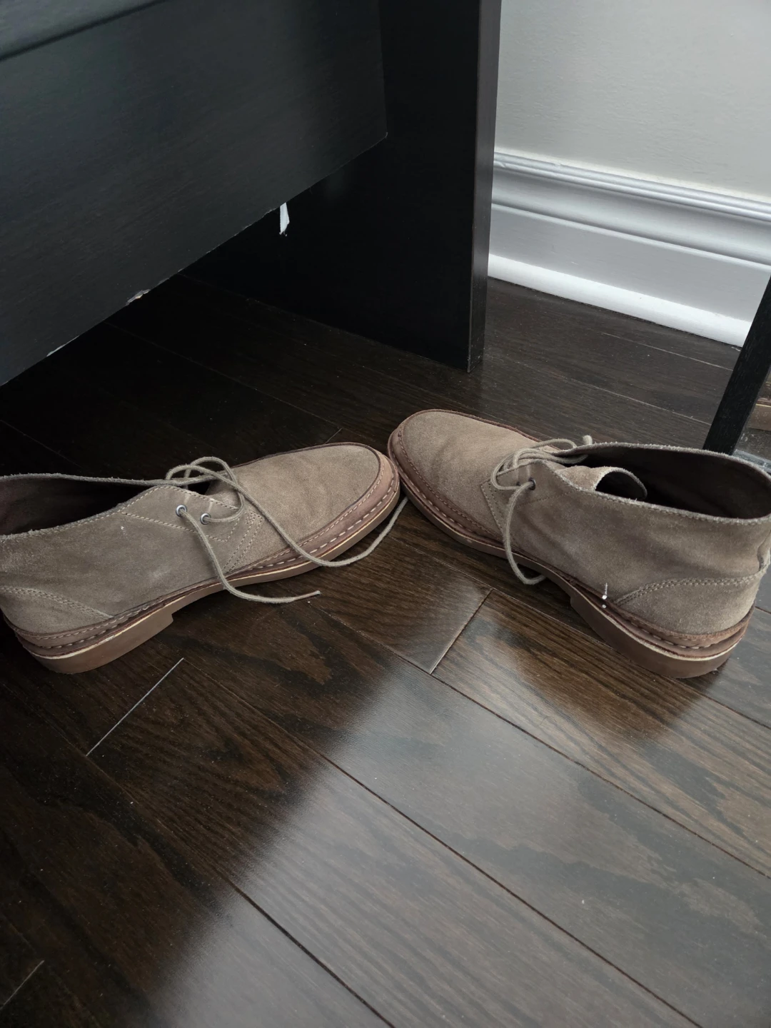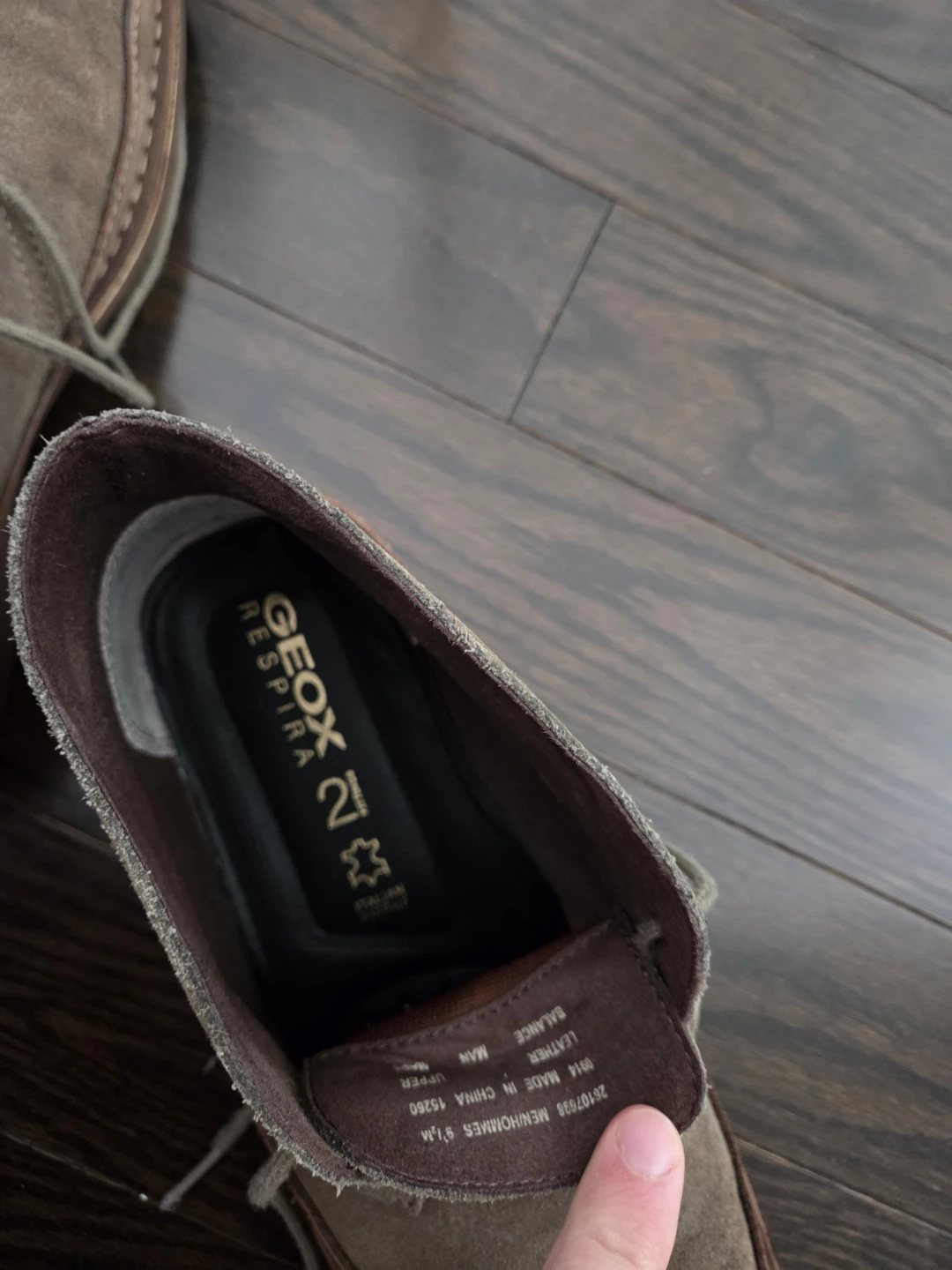 These GEOX Respira chukka boots are made from suede. They're a men's size 9.5 with a comfortable balance. Leather upper and made in China.