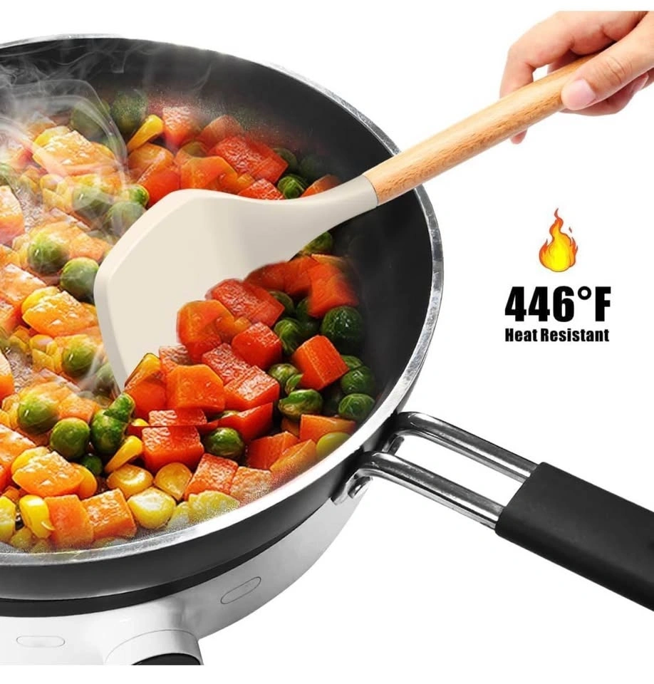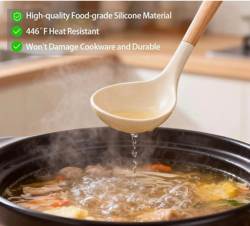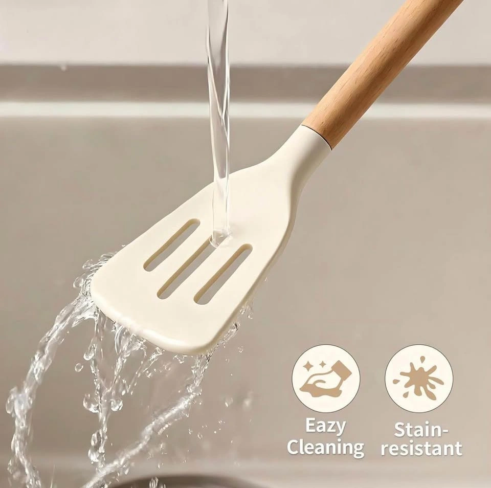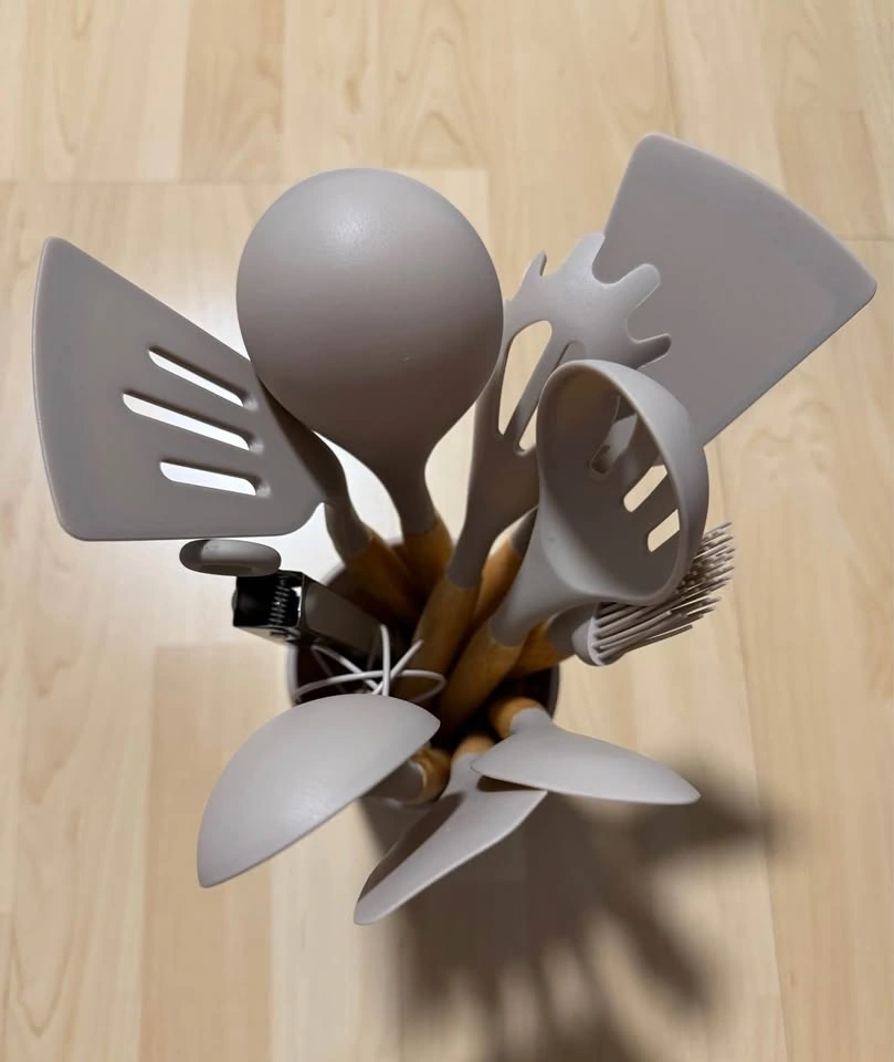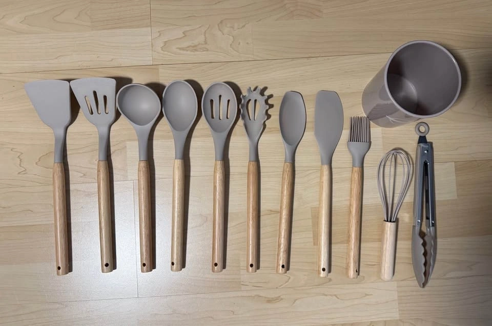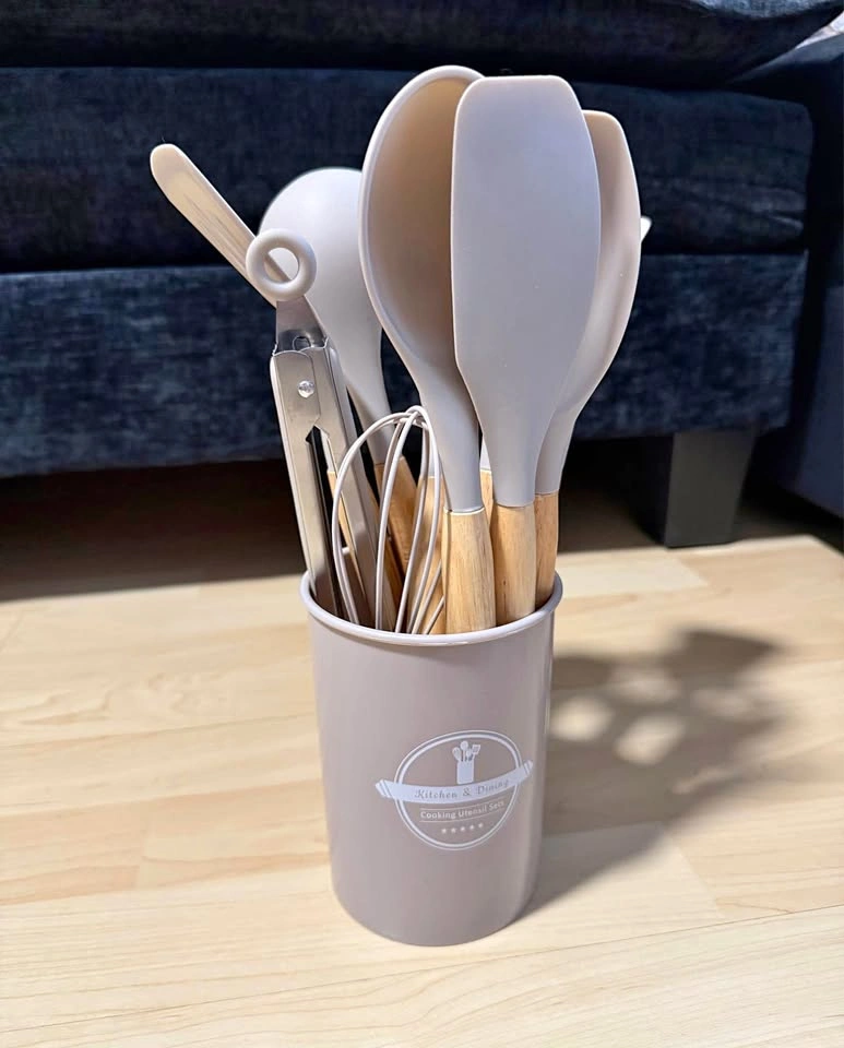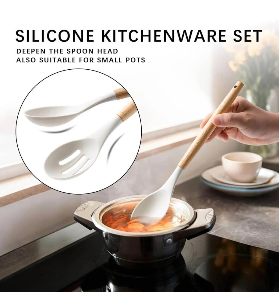 Full 12-piece set (including holder) with: Spatula, slotted spatula, solid spoon, slotted spoon, ladle, pasta server, whisk, tongs, brush, turner, and more. Soft food-grade silicone heads with natural wooden handles.