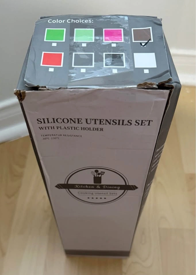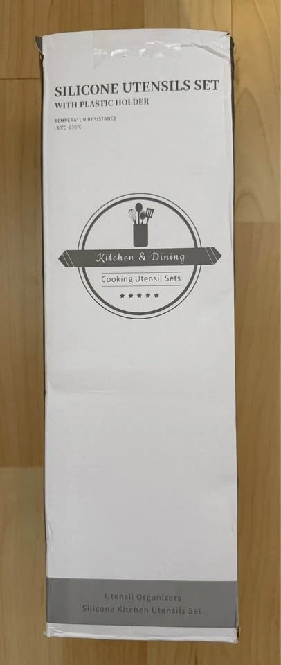 Heat resistant up to 230°C – safe for all nonstick cookware. Matching gray plastic holder for neat countertop storage. Dishwasher safe, BPA-free, easy to clean.