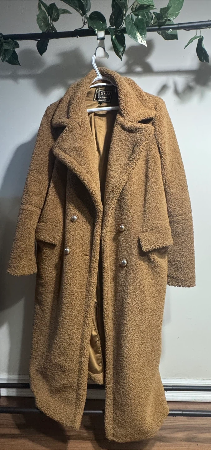Gorgeous Guess teddy coat in a rich brown colour. It's a size medium and features a cosy, fuzzy exterior with a silky interior lining. Double-breasted with stylish gold buttons, this coat is perfect for keeping warm on chilly days!