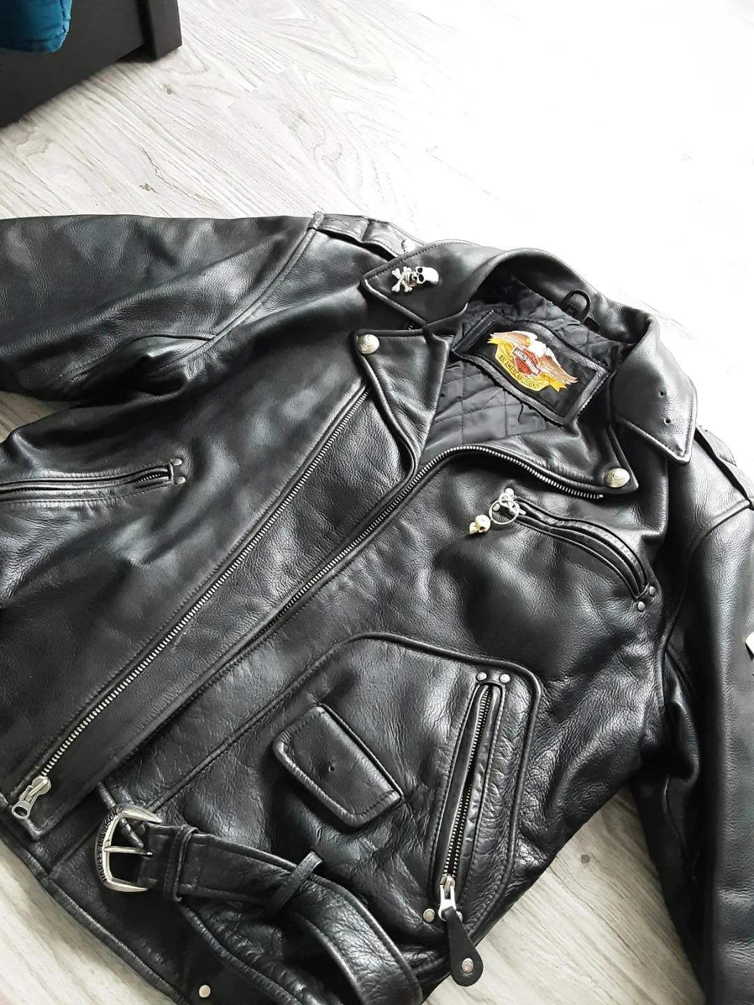 Classic black leather motorcycle jacket from Harley-Davidson. Features a quilted lining and lace-up sides. Includes iconic eagle emblem on the back. A true American legend!