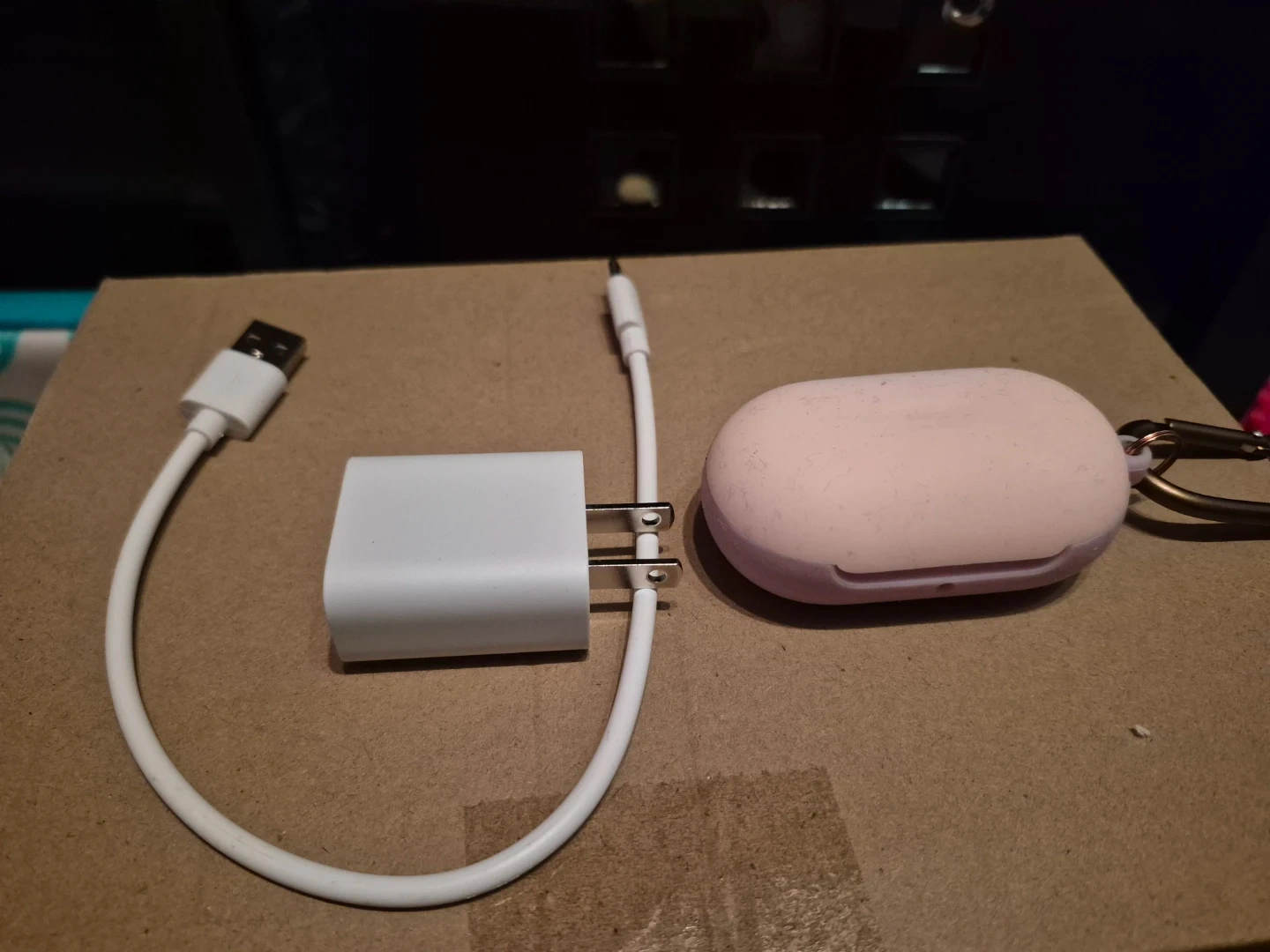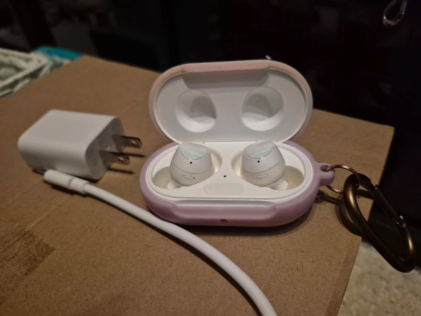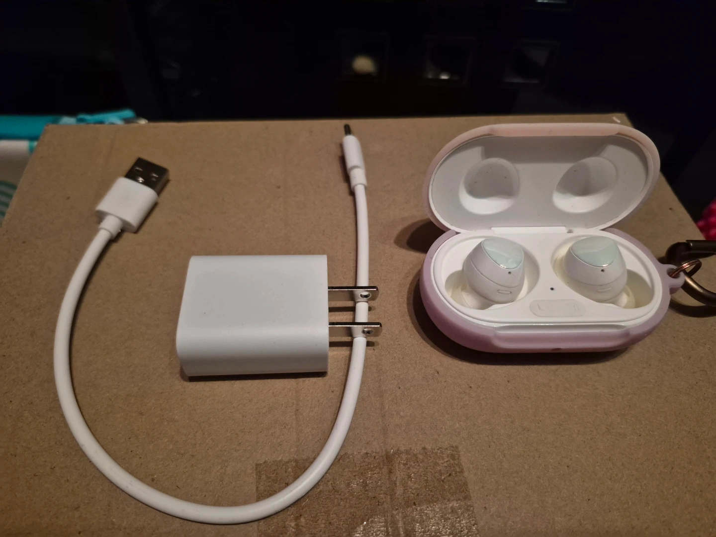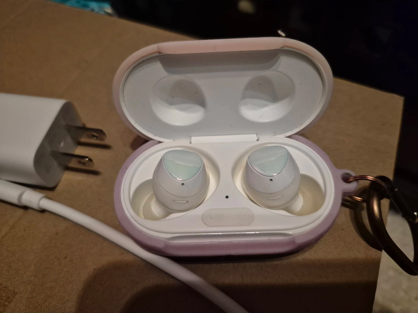 White Samsung Galaxy Buds with charging case and charger. Includes original earbuds and charging cable. These earbuds offer great sound quality for everyday use.