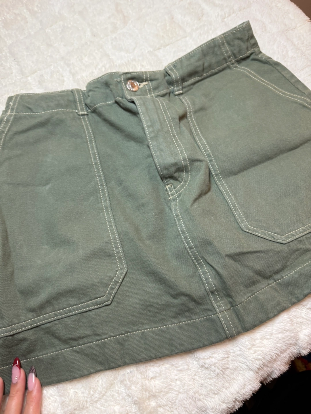 Cute olive green mini skirt. Features a button and zipper closure. Two pockets on the front. Made of a durable cotton material. Perfect for spring and summer.