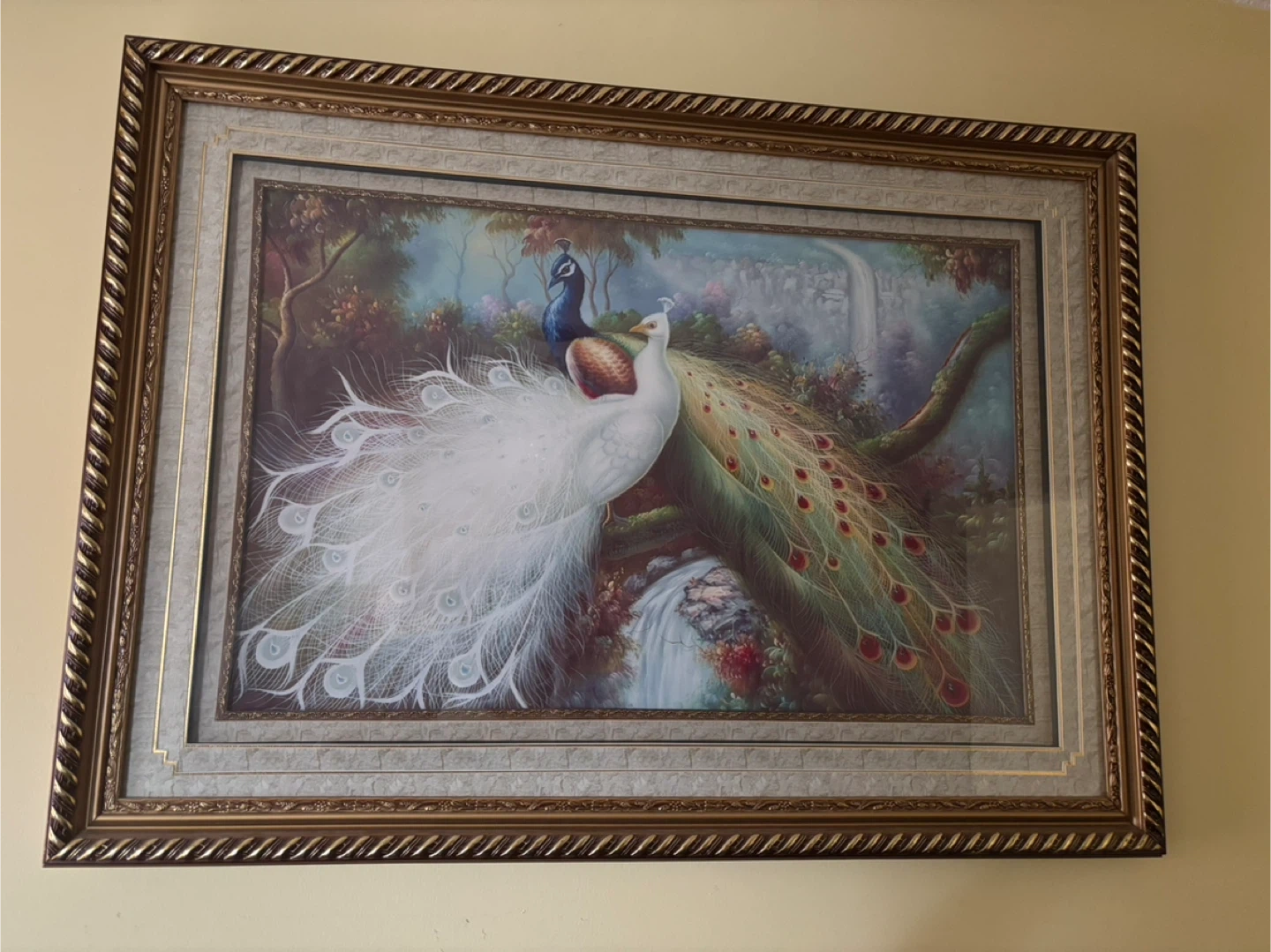 Beautiful framed artwork featuring two peacocks, one white and one blue, in a natural setting with a waterfall. The frame is ornate and gold-toned. Adds a touch of elegance to any room. Measures approximately 24x36 inches.