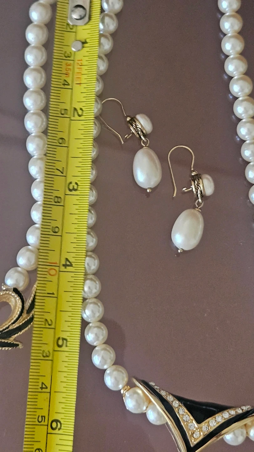 This Napier set includes a faux pearl necklace with a decorative clasp and matching dangle earrings. The necklace features a floral-inspired clasp with black enamel accents. The earrings also have pearl drops and black detailing.