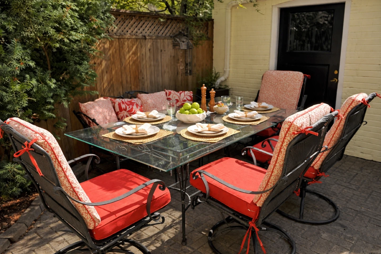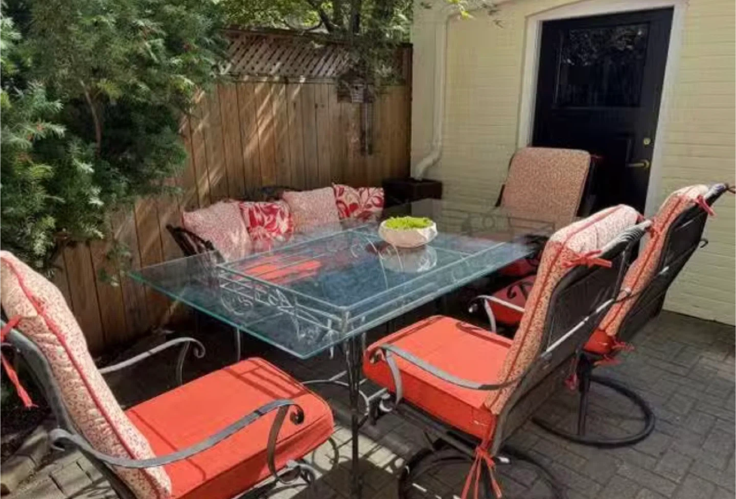 This is a wrought iron patio dining set with a glass tabletop. It includes four chairs and a matching table. The chairs have comfortable cushions.