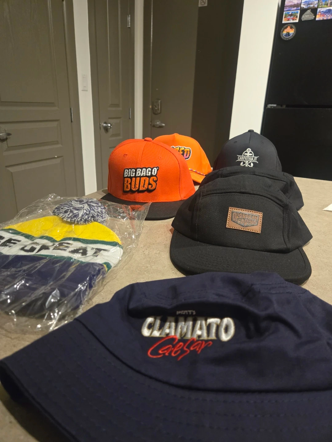This lot includes a variety of hats and a beanie. Items feature different brands and graphics.