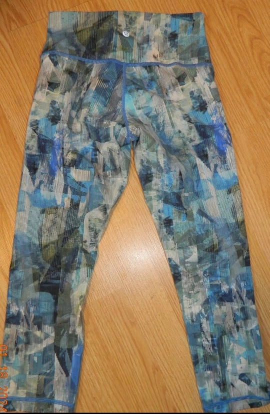 These are a pair of Lululemon leggings in a blue and green abstract pattern. They appear to be in good condition. Please reach out if you have any questions!