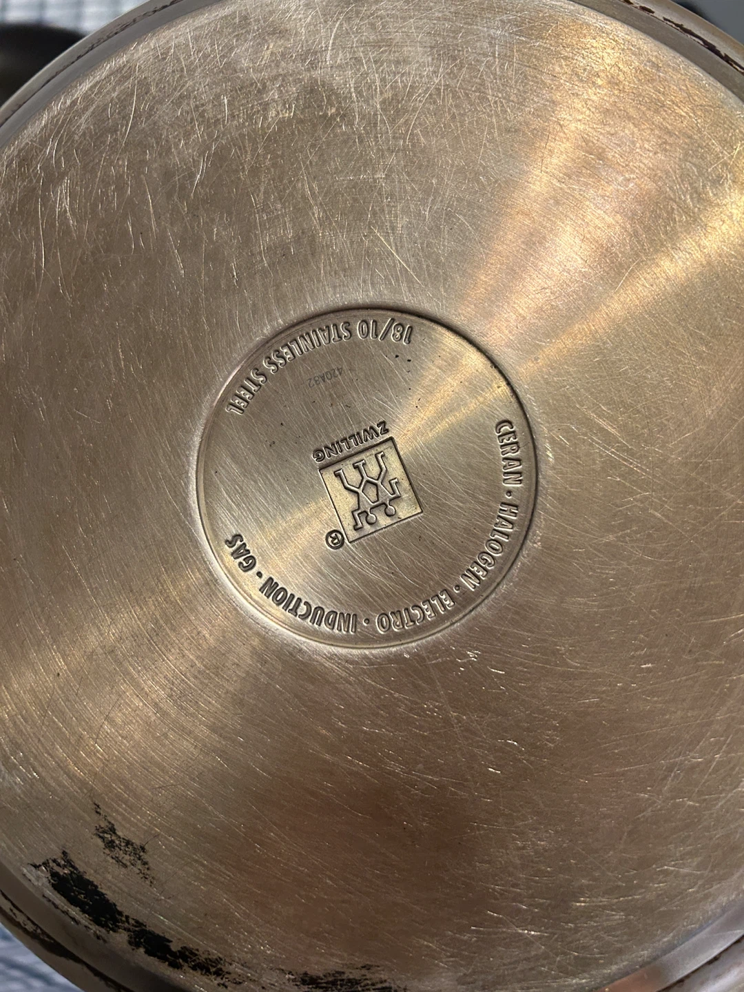 Selling a Zwilling J.A. Henckels fry pan. It's made of 18/10 stainless steel and suitable for induction, gas, electro, and halogen cooktops. It does show some signs of use.