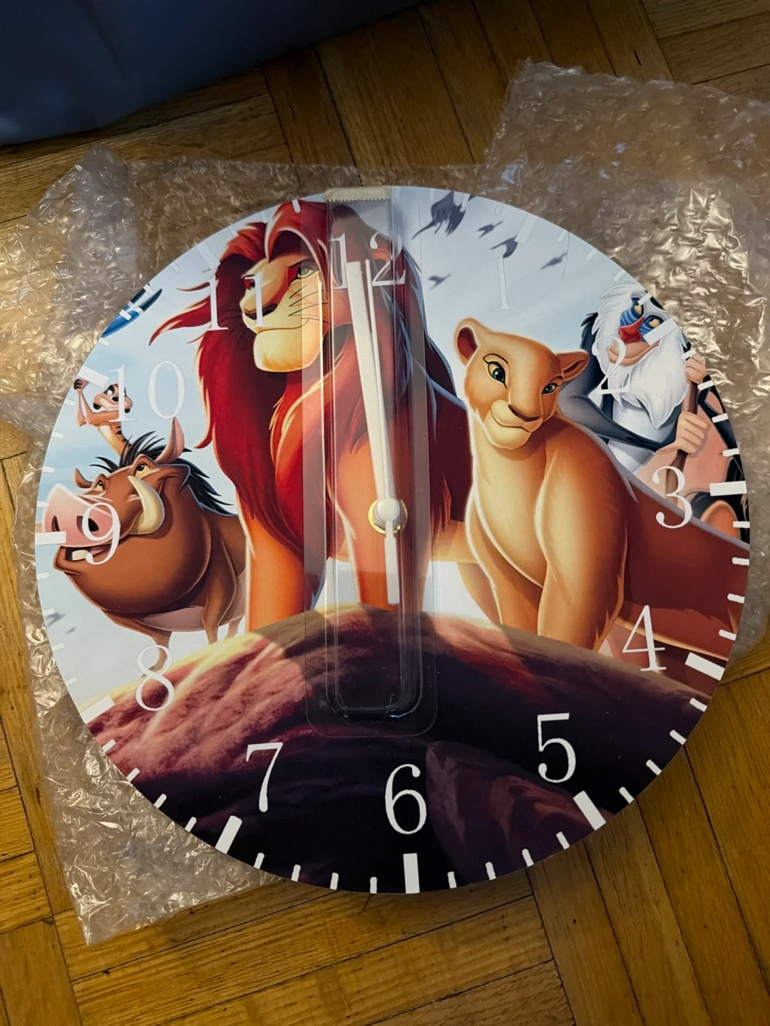 Cute Lion King clock for a kid's room or any Disney fan! The clock features Simba, Nala, Pumbaa, Timon, and Rafiki. It's in great condition and ready to hang on your wall