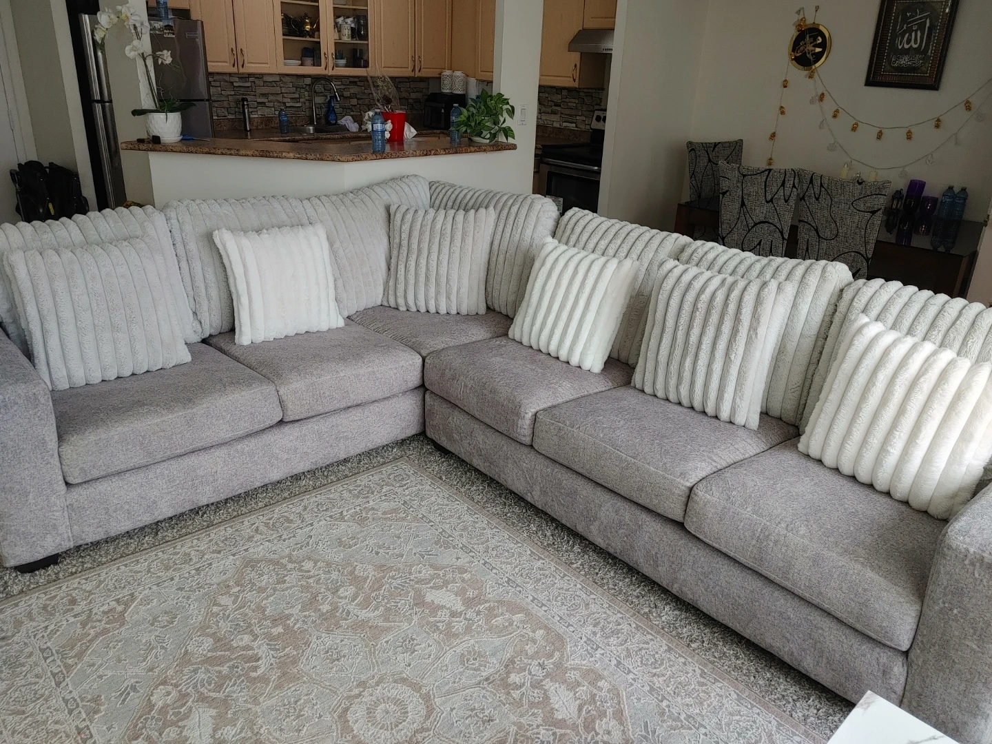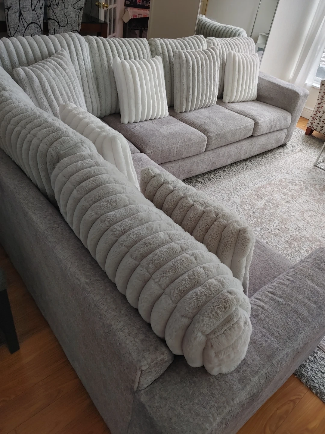Cozy grey sectional sofa featuring plush, textured throw pillows in varying sizes. It's made with a durable fabric and offers ample seating space for your living room. This sofa is perfect for relaxing evenings at home!