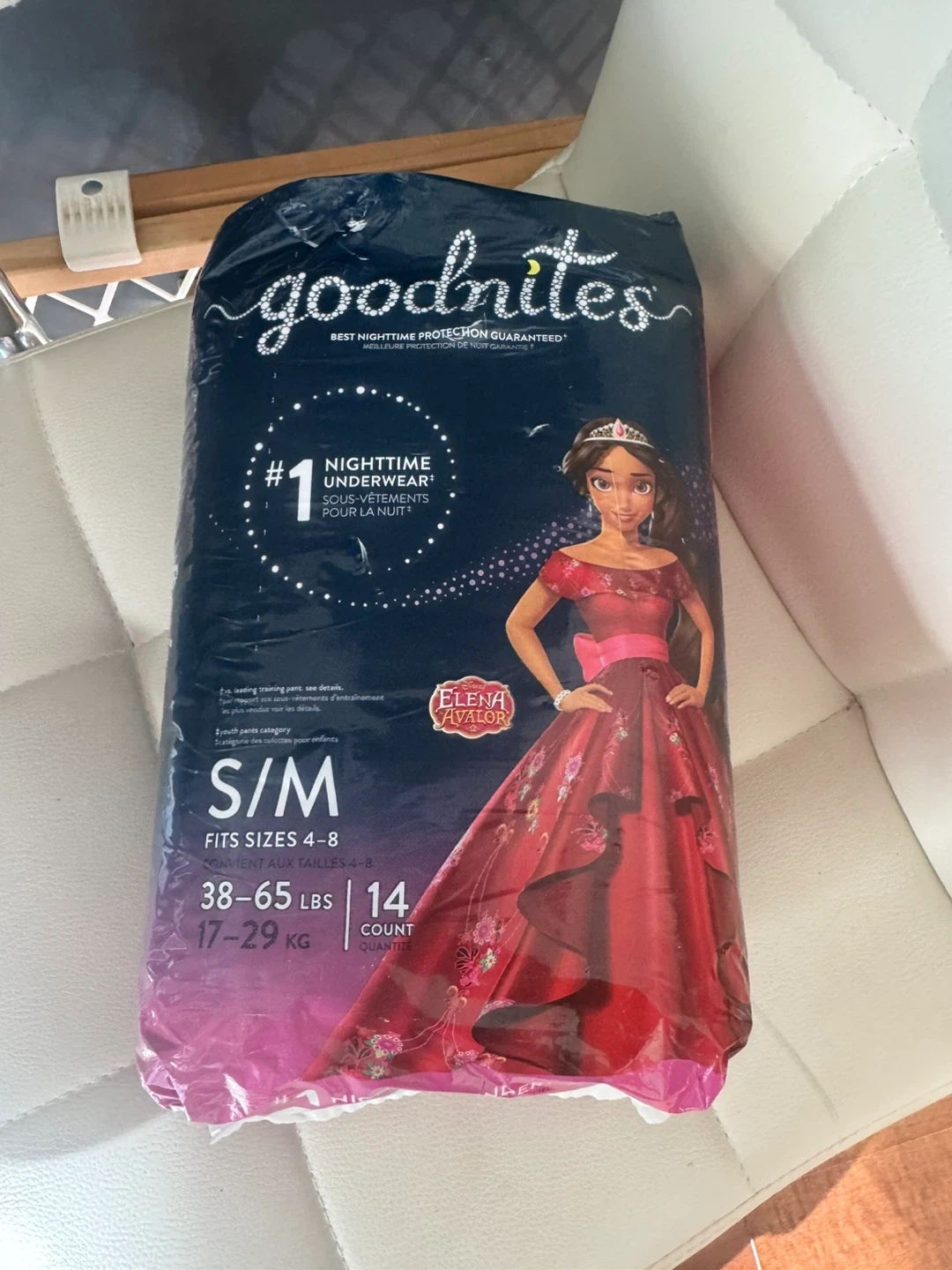 GoodNites S/M nighttime underwear for girls, size 4-8. Fits 38-65 lbs. Offers 40% more protection with a 5-layer system and odor absorbing properties. Includes fun prints and patterns.small sizes