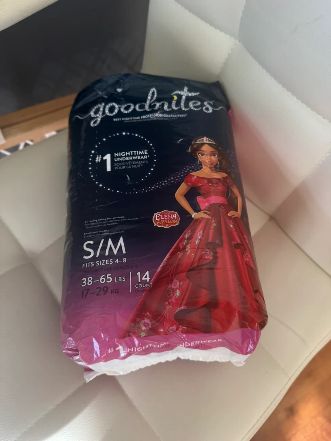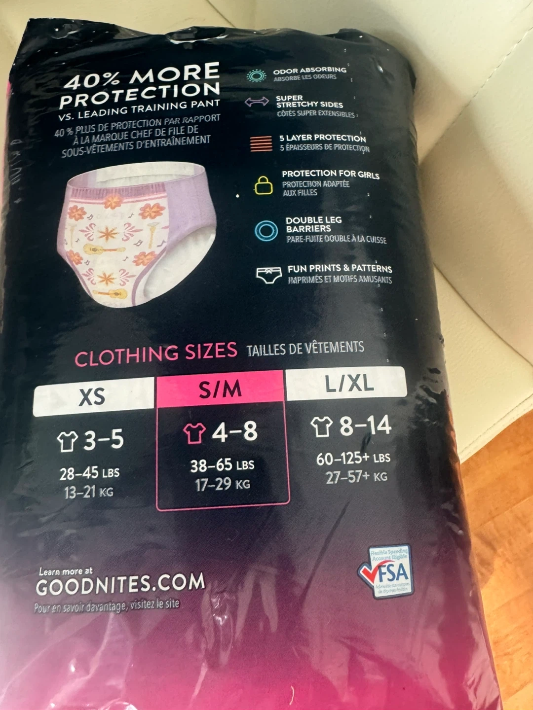GoodNites S/M nighttime underwear for girls, size 4-8. Fits 38-65 lbs. Offers 40% more protection with a 5-layer system and odor absorbing properties. Includes fun prints and patterns.small sizes