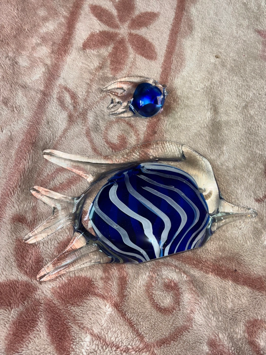 Beautiful art glass angelfish figurines, one larger with blue and white stripes and a smaller blue one. They're made of clear glass with vibrant blue accents. Big one weighing 6 lbs and the small one weighing about 2 lbs.