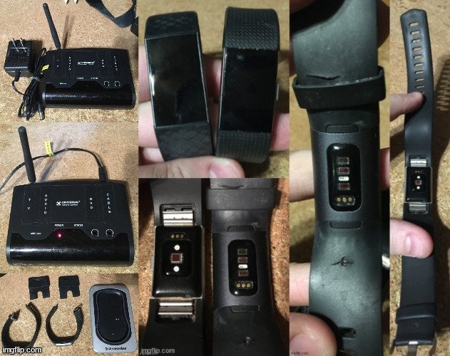 2X FITBIT TYPE THINGS, ONE SAYS FITBIT THE OTHER IS UNBRANDED, FITBIT BAND IS CRACKED NO CHARGER