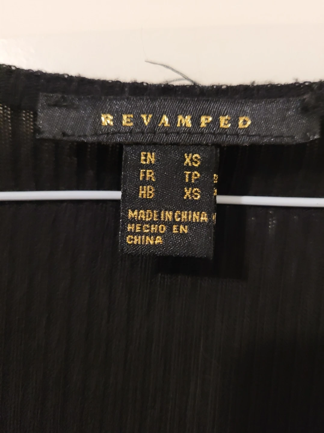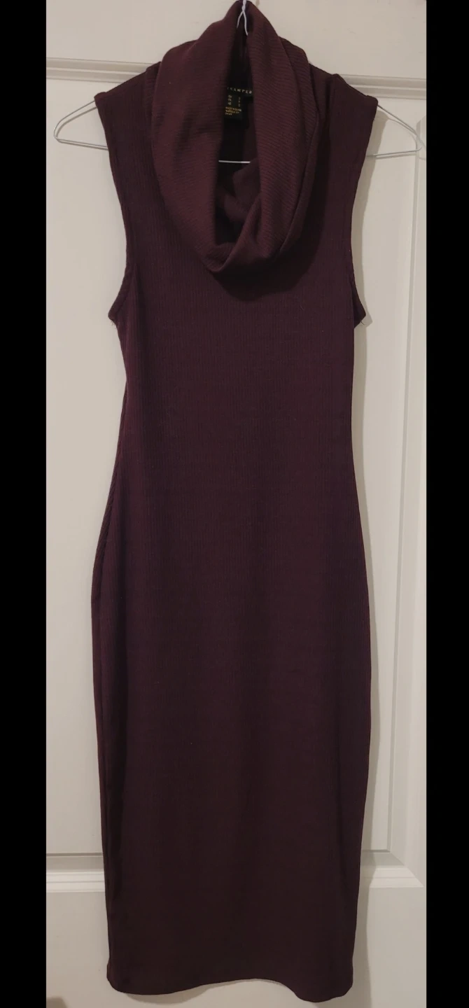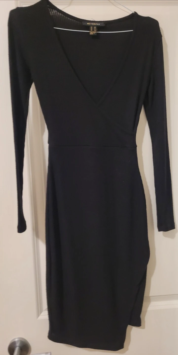 I have a black dress with a V-neck and long sleeves, size XS. Also, a black jumpsuit with spaghetti straps, size XS. And a sleeveless cowl neck dress in a burgundy colour, size S