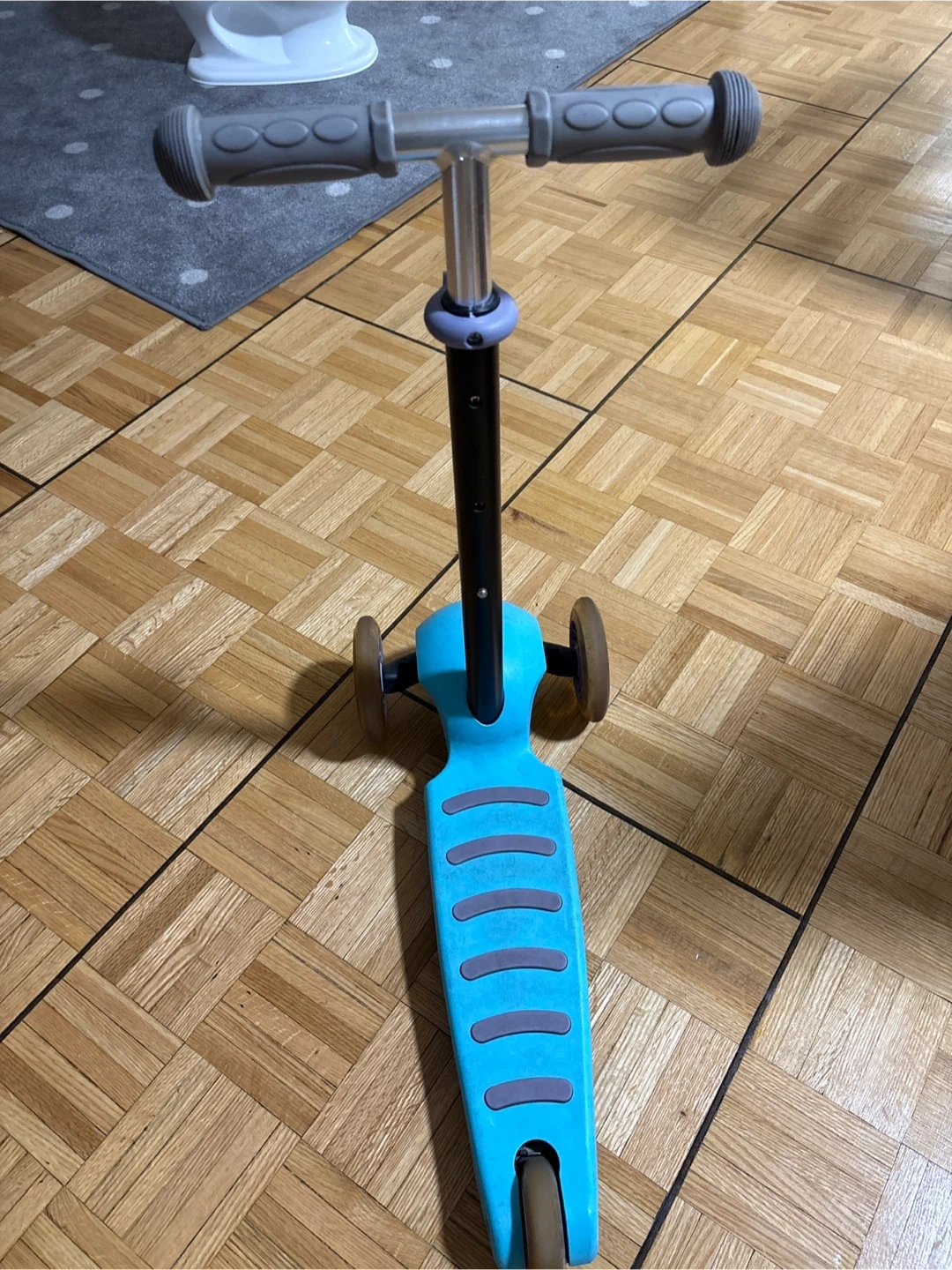 This is a KIMBER 3-wheel scooter, perfect for younger riders. It features a bright blue deck with purple grip details and comfortable grey handlebars. The three-wheel design offers stability for beginners. It's a fun way for kids to get around!