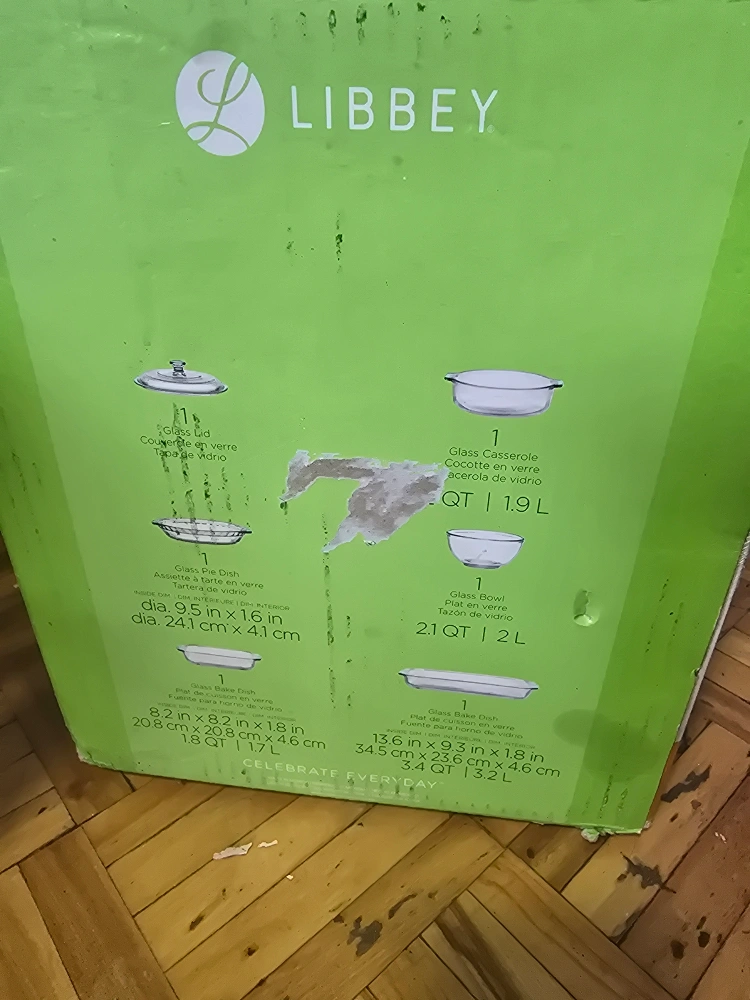 Set includes a casserole dish, pie plate, mixing bowl and three square dishes. Oven, microwave, dishwasher, and freezer safe.