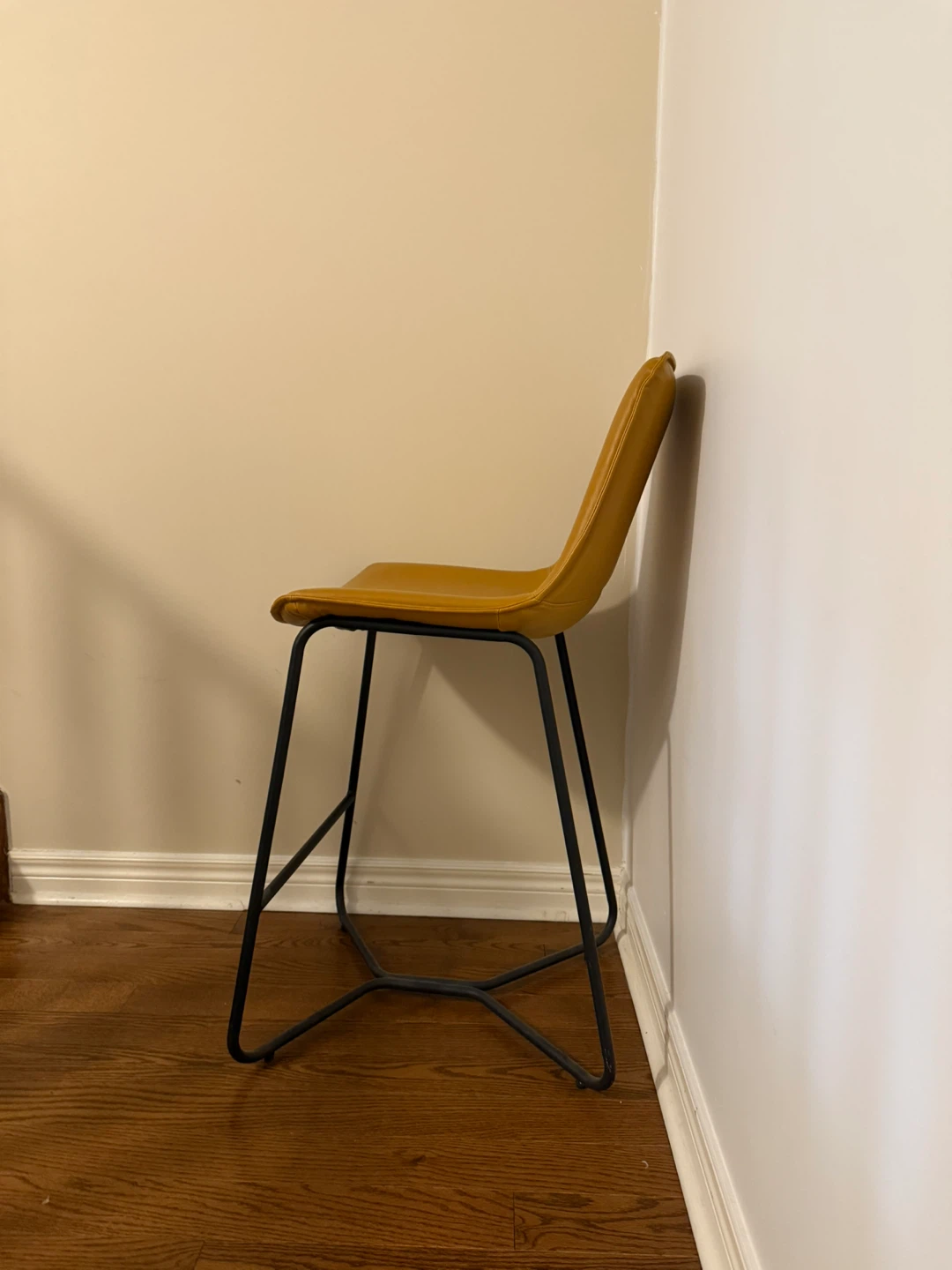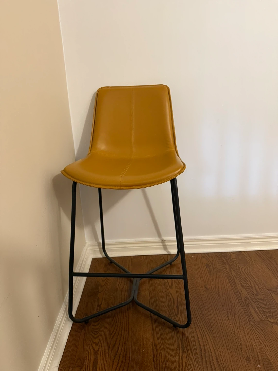 This bar stool features a stylish yellow upholstered seat and a sturdy black metal base. Its modern design makes it a great addition to any kitchen island or home bar. The stool's construction provides a solid seating option.
