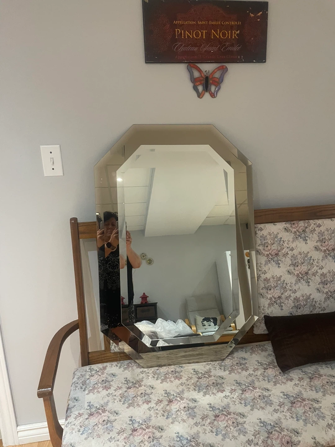 This octagonal mirror features a bevelled edge for a decorative touch. It's a good size for an entryway or accent piece. Its reflective surface can brighten up any room!
