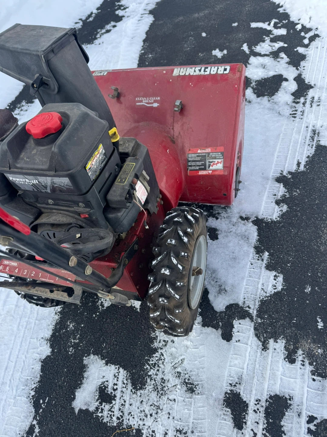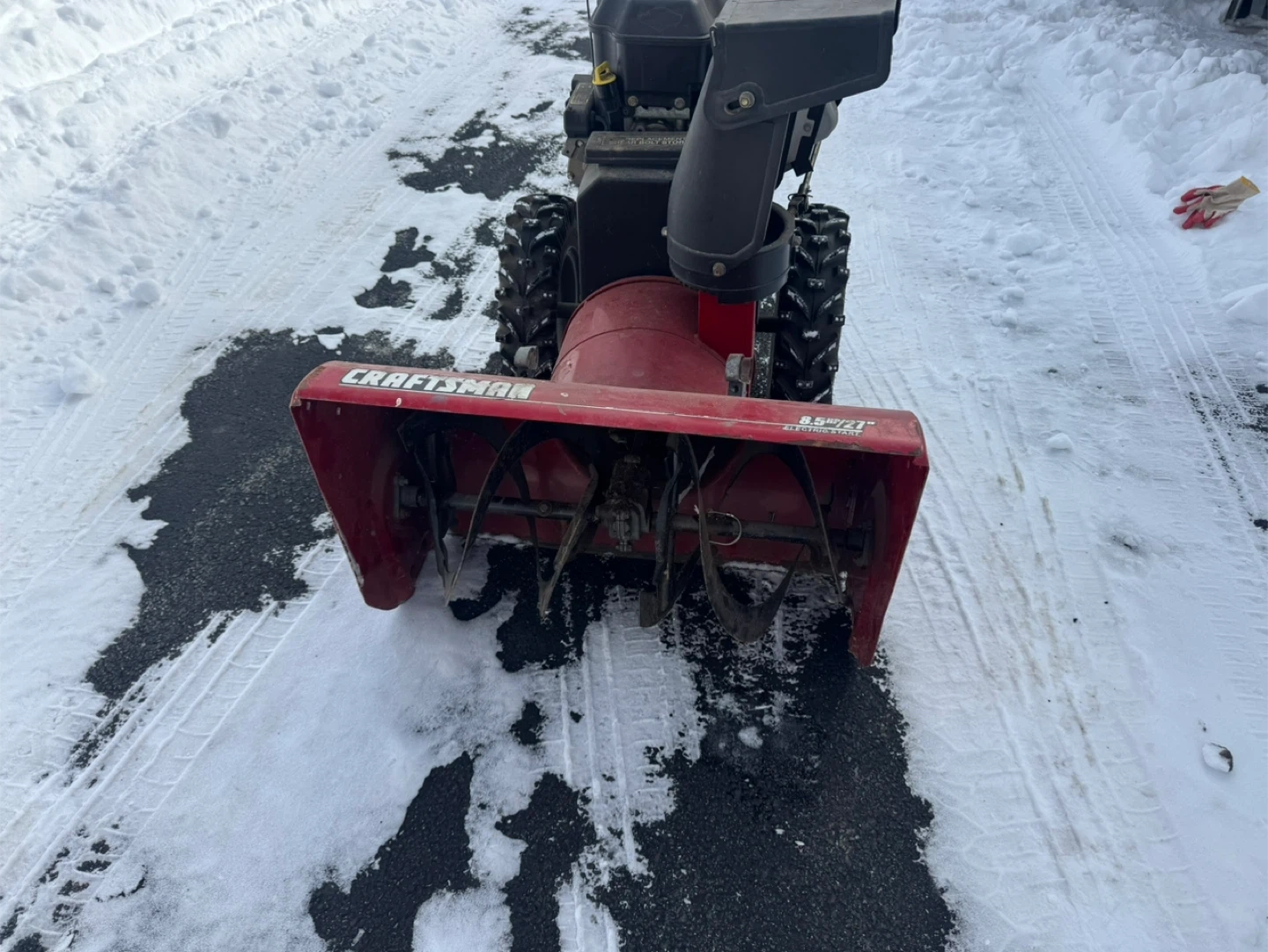 This is a red Craftsman snow blower with a 8.5 horsepower engine and a 27-inch clearing width. It features large, treaded tires for traction. The machine has a pull start and a chute for directing snow.
