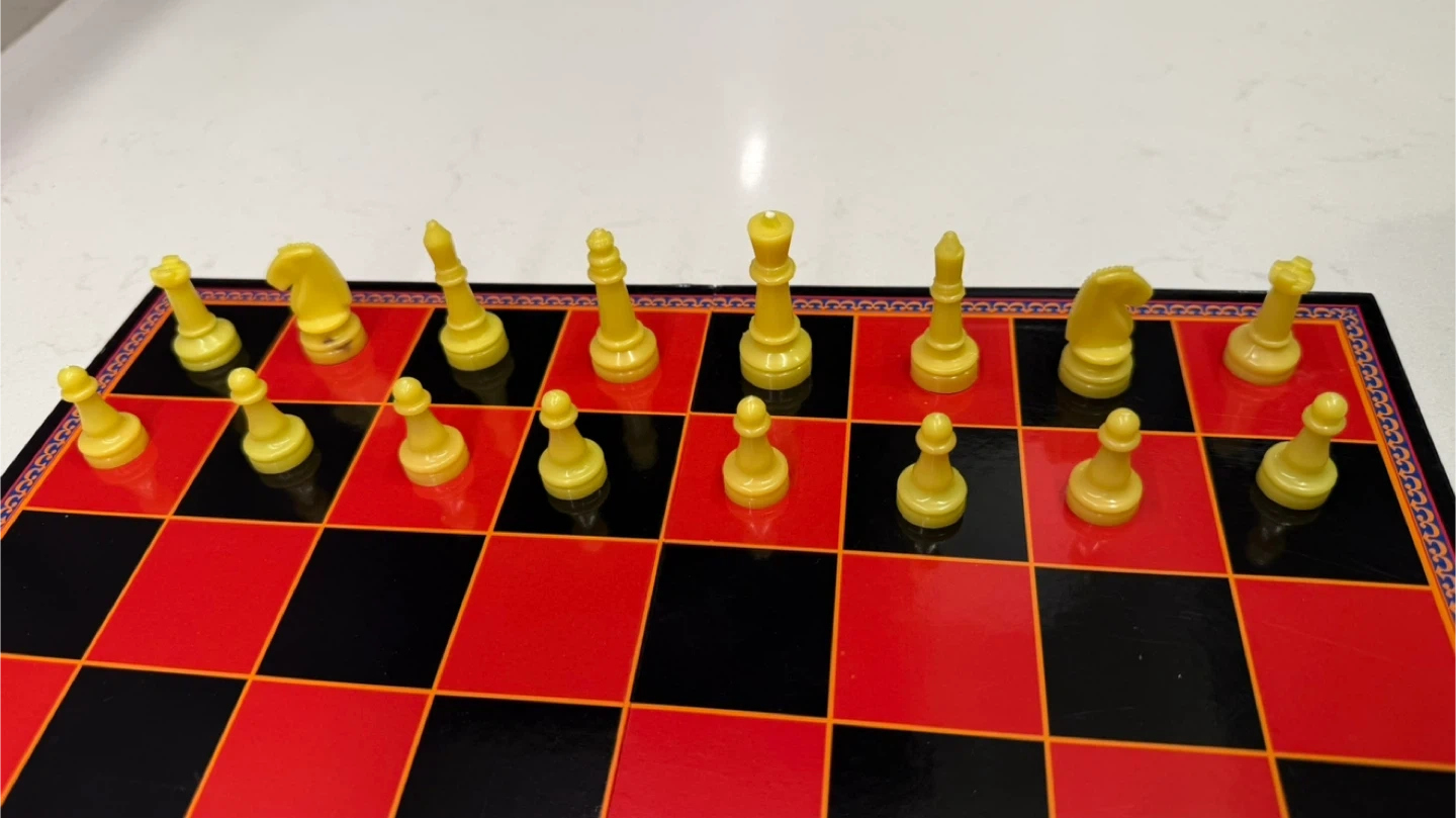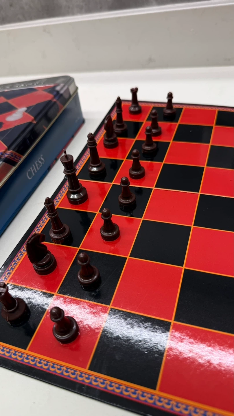 This is a Classic Games chess set in light weight plastic pieces. It includes a foldable board and two sets of playing pieces.