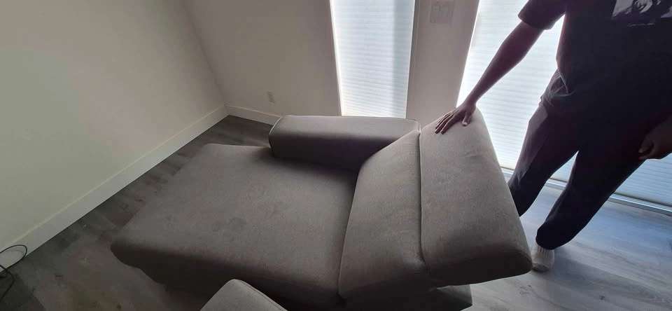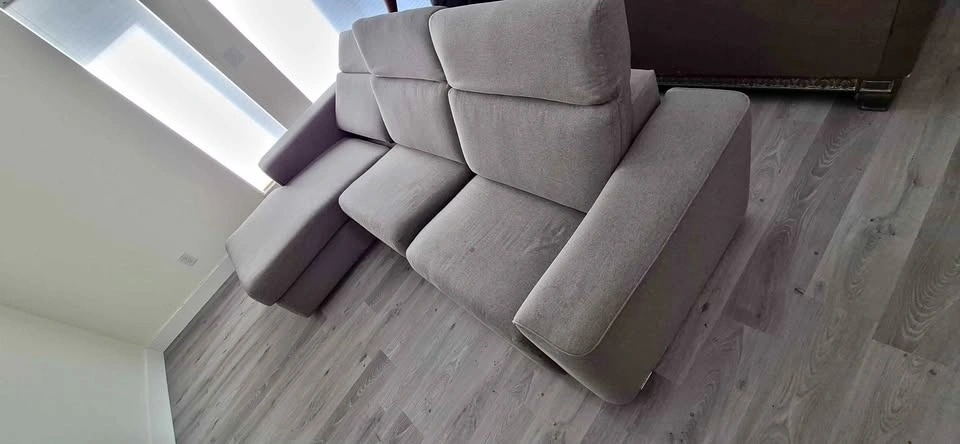 Selling a comfortable and spacious modern grey sectional sofa. This piece features a clean-lined design that fits perfectly with contemporary or minimalist decor. It is a 3-piece modular set including a left-side seat, a middle seat, and a deep right-side reclining lounge.