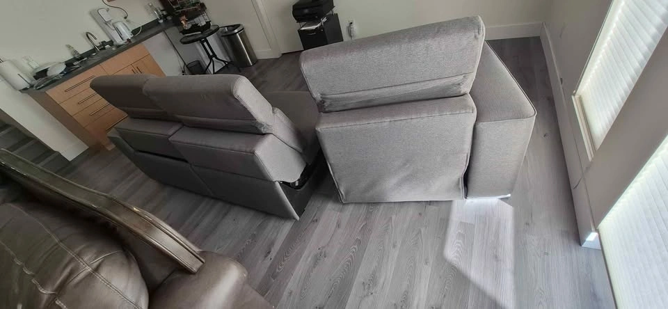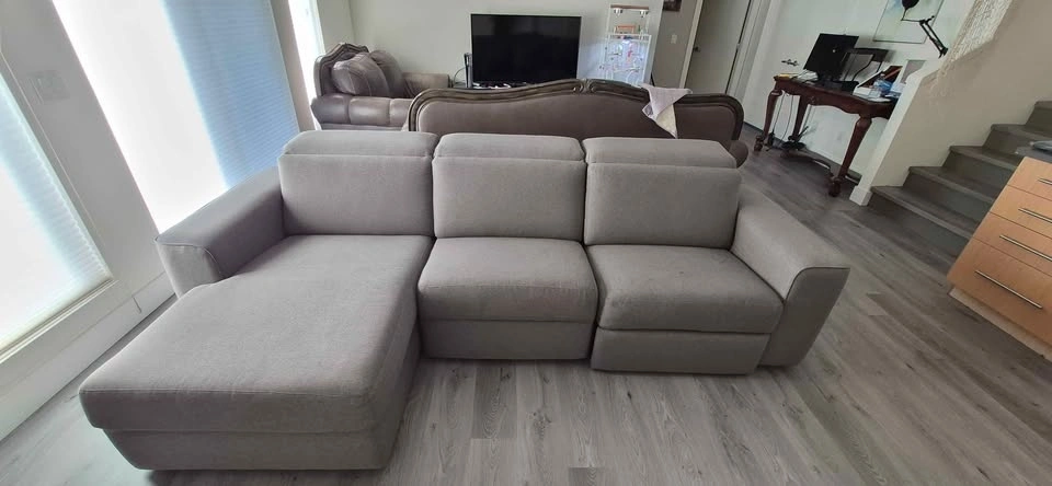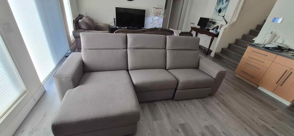 Selling a comfortable and spacious modern grey sectional sofa. This piece features a clean-lined design that fits perfectly with contemporary or minimalist decor. It is a 3-piece modular set including a left-side seat, a middle seat, and a deep right-side reclining lounge.