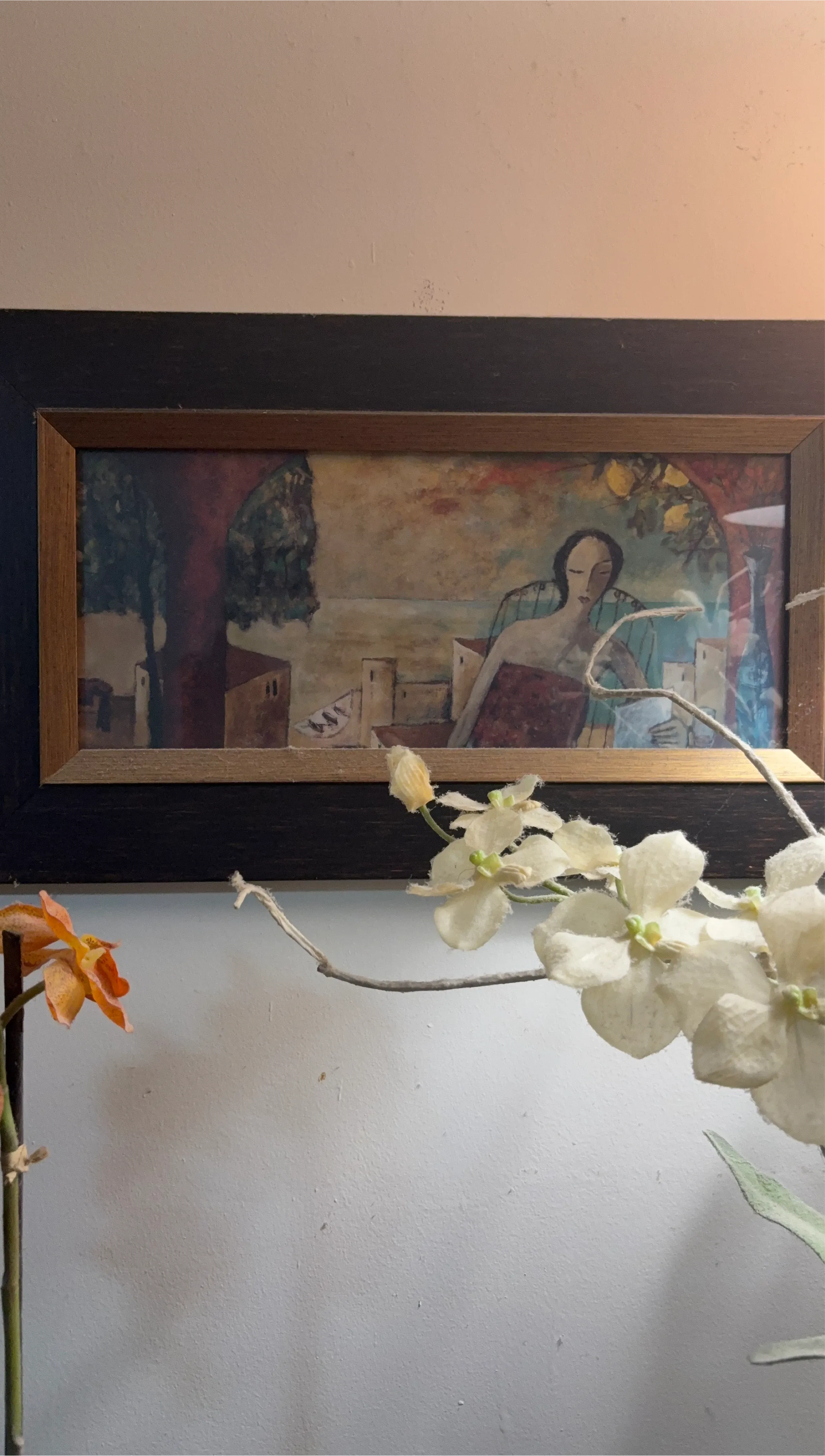 This is a framed art print depicting a woman with a serene expression, set against a backdrop of a Mediterranean village and a lemon tree. The artwork is framed in a dark wood with a lighter wood inner trim. It's a beautiful piece for any home decor!