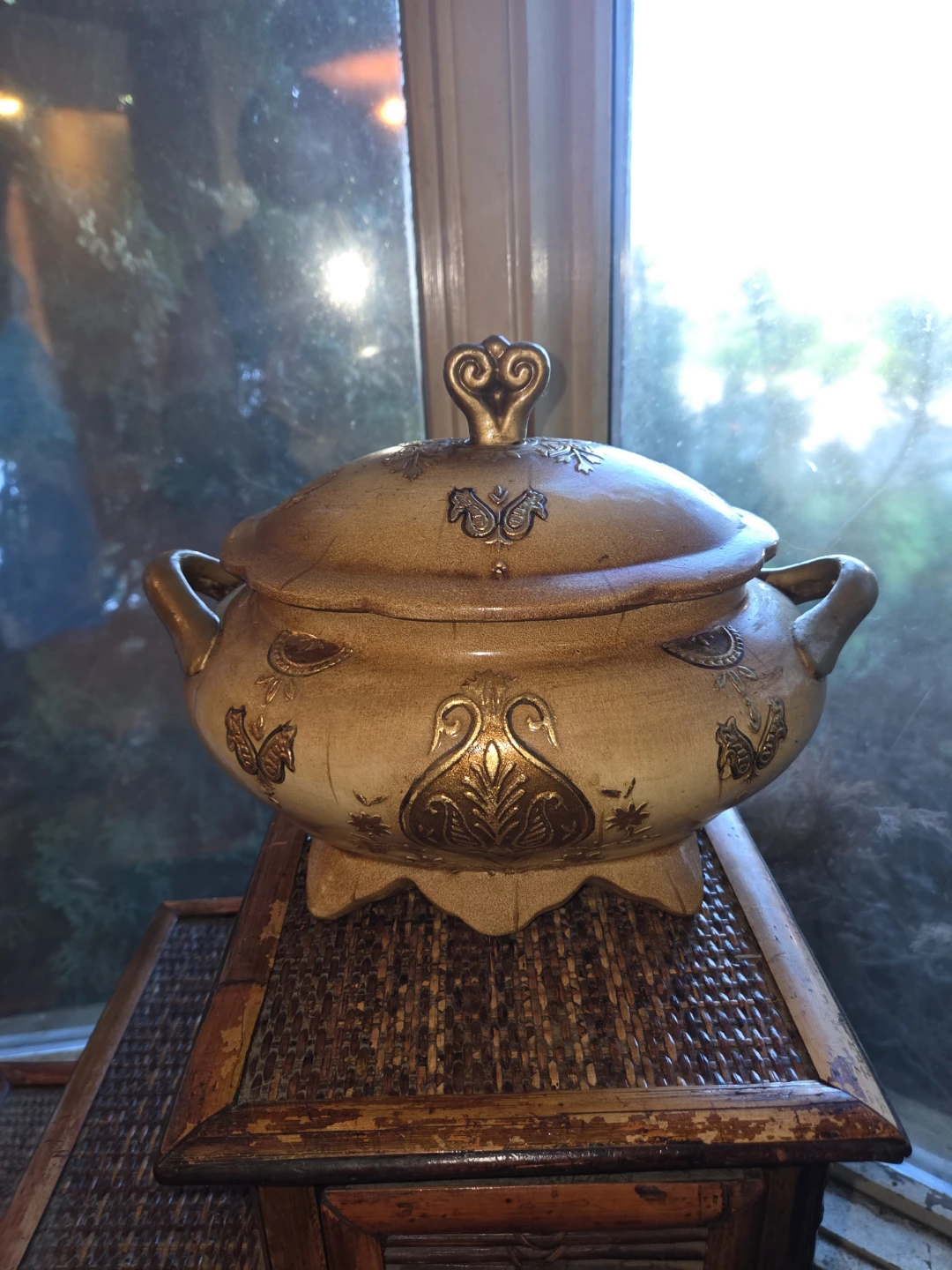 This ceramic tureen features a lovely antique gold finish with decorative embossed details. It has two handles and a matching lid with a decorative knob. It's a beautiful piece for serving or display.