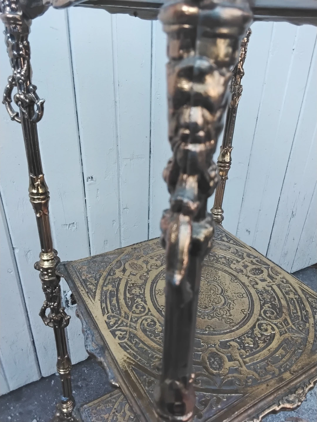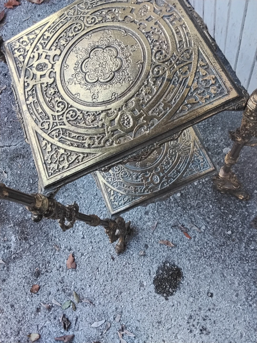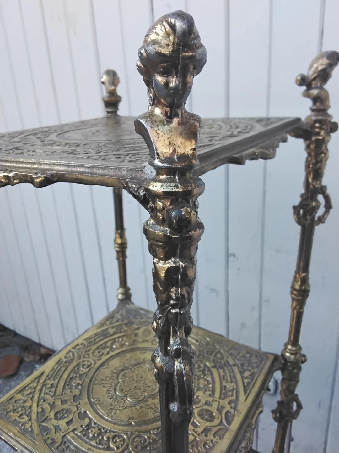 ✨️Selling a unique SUPER VINTAGE antique cast iron Figural Renaissance brass 3-tiered (plant) table! It features detailed engravings on each tier and decorative figurines on the corners and legs. This piece would add a touch of antique charm to any room! You can put other things on this table other than plants, as well! 👌