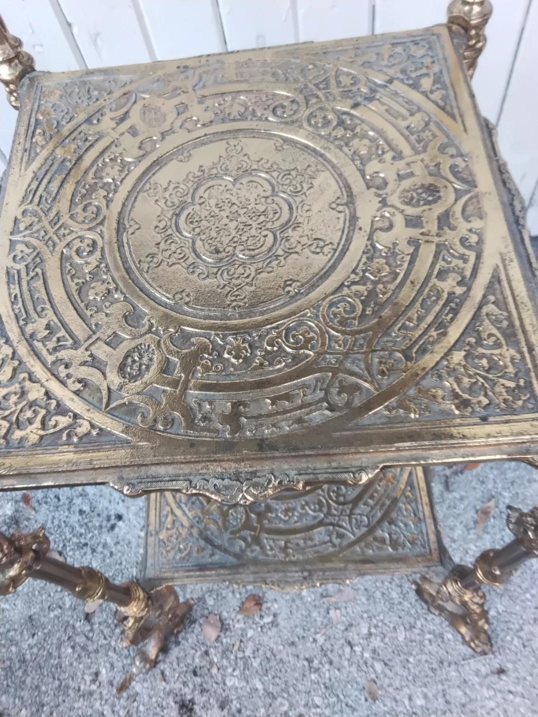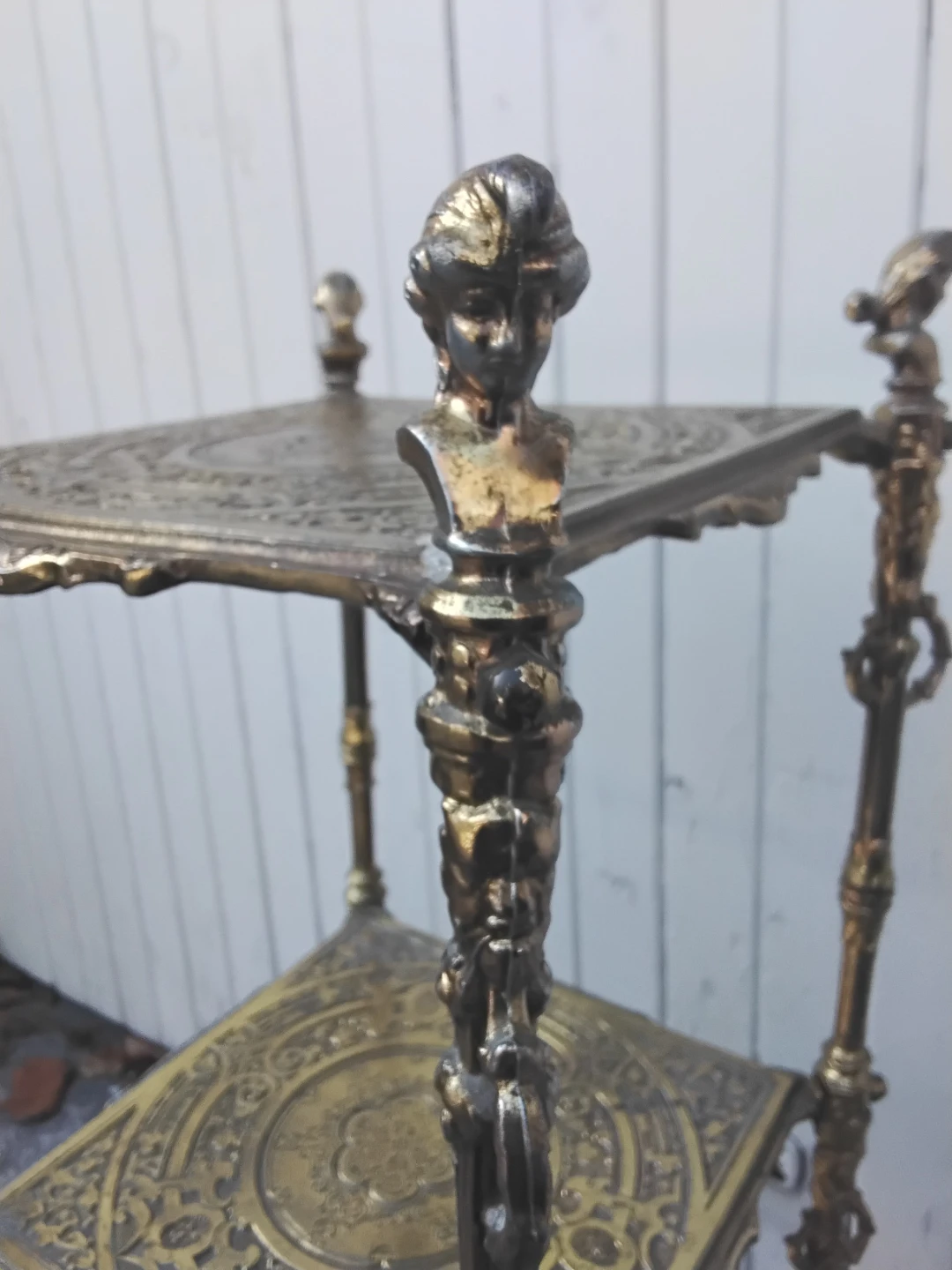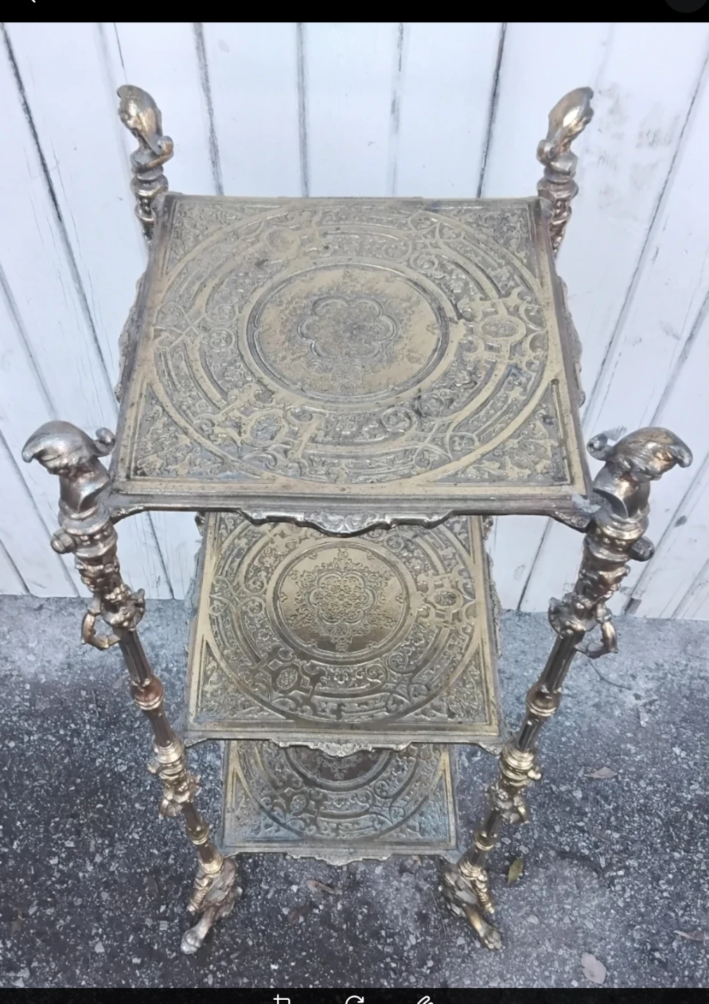 ✨️Selling a unique SUPER VINTAGE antique cast iron Figural Renaissance brass 3-tiered (plant) table! It features detailed engravings on each tier and decorative figurines on the corners and legs. This piece would add a touch of antique charm to any room! You can put other things on this table other than plants, as well! 👌
