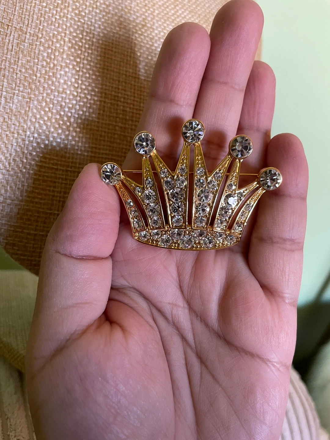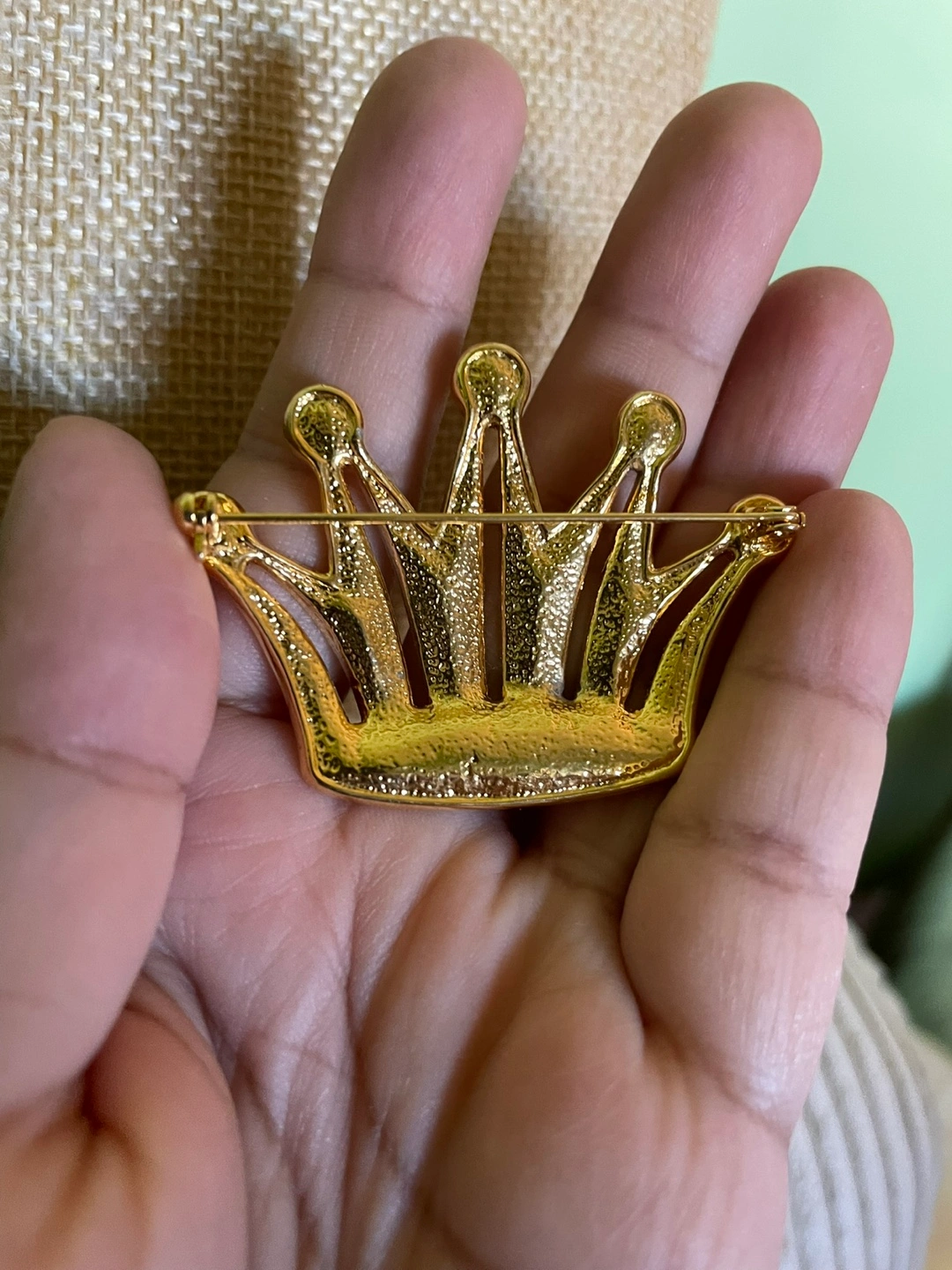 Gorgeous gold-tone brooch shaped like a crown. Encrusted with clear crystals. Matching pair of large hoop earrings, also crystal-encrusted and stunning white crystal bracelet. Elegant bundle, perfect for adding a touch of sparkle to any outfit.