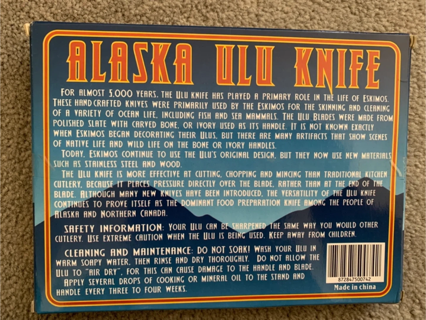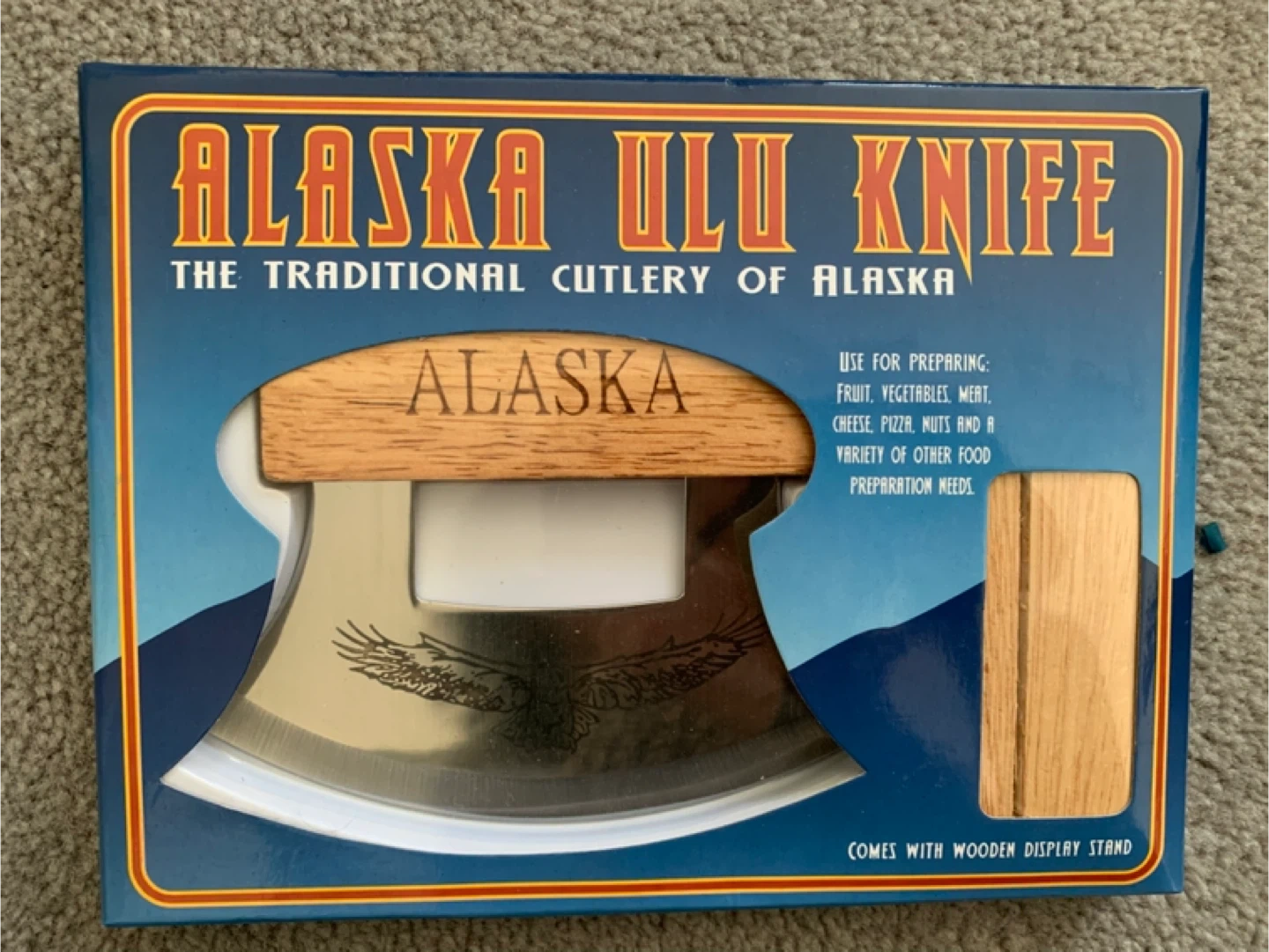 This is an Alaska Ulu Knife, the traditional cutlery of Alaska. It's made with stainless steel and wood. Comes with a wooden display stand. This versatile knife is effective for cutting, chopping, and mincing.