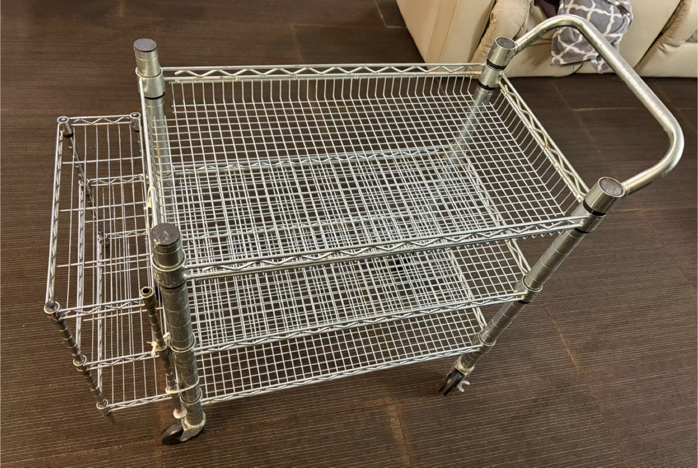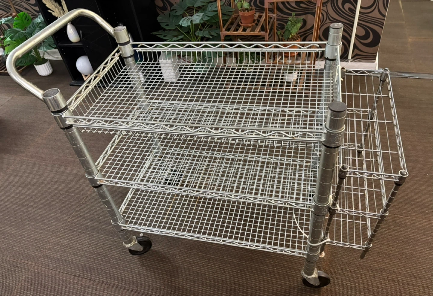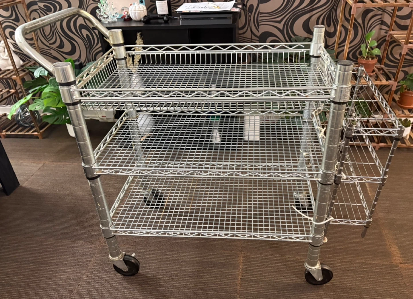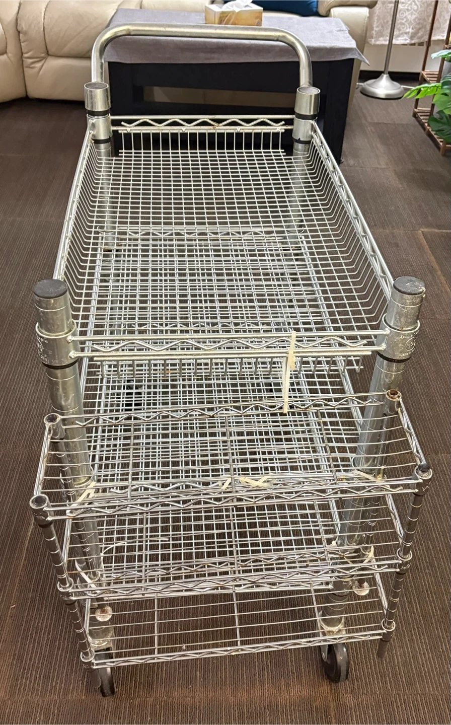 Selling a metal wire shelving cart on wheels. It has multiple tiers for storage or transport. Perfect for organizing items in your home or workspace. It's in good condition and ready to use! The tires work perfectly and so do the wheel locks.
