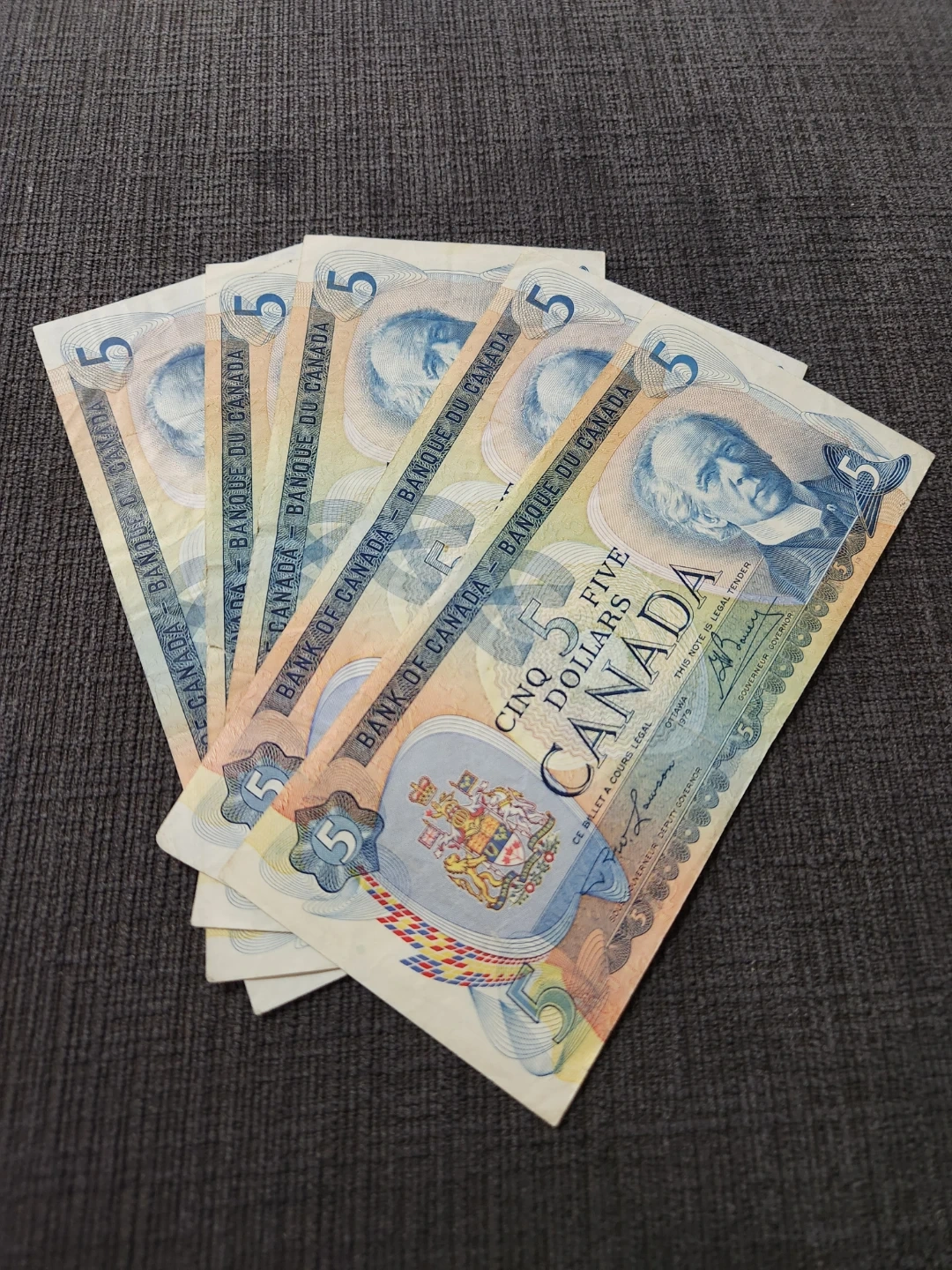 Five Canadian five-dollar banknotes. These bills feature the Bank of Canada branding. They are legal tender. 1979 Paper currency, All 5 for $50 Firm