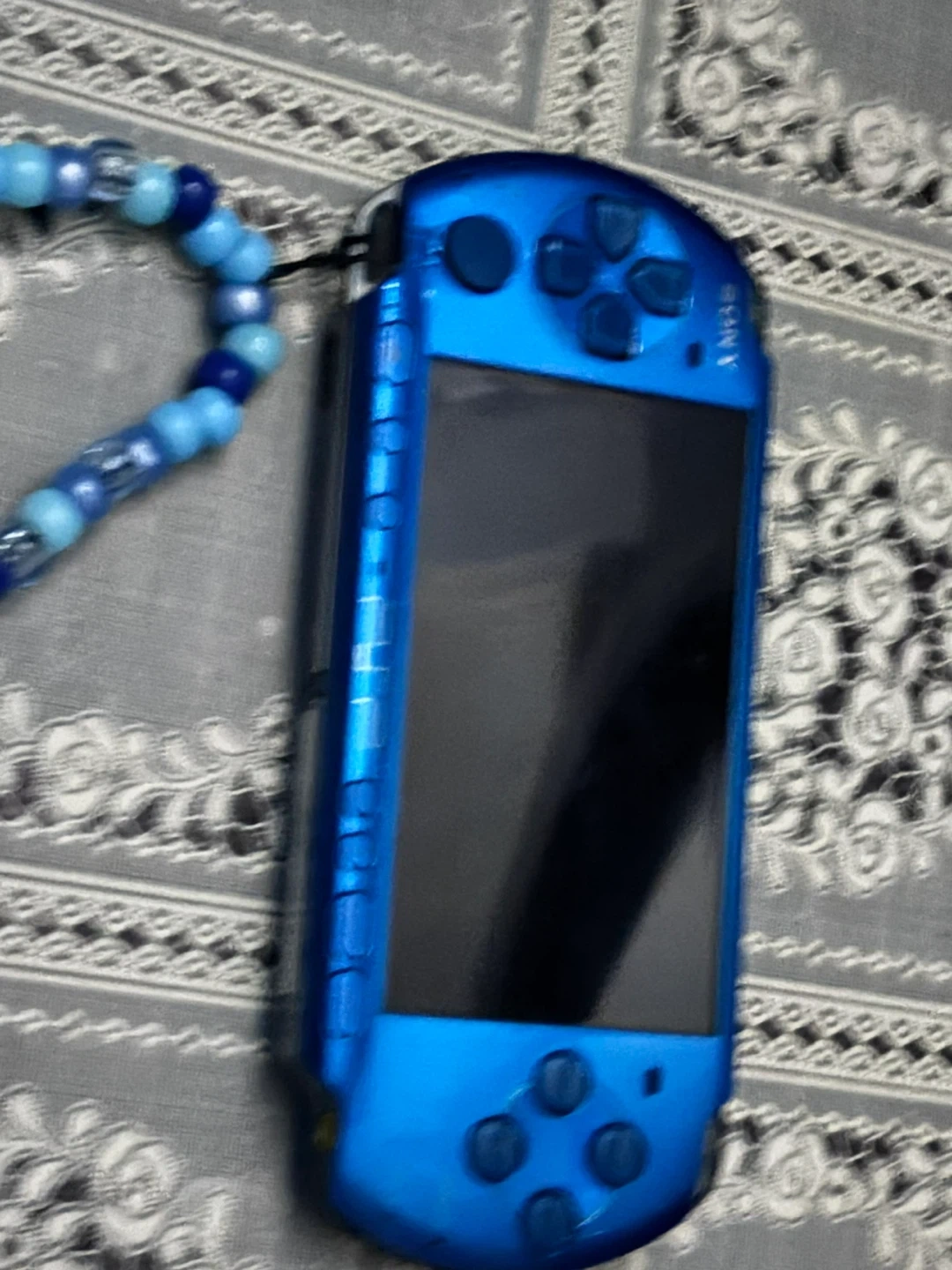 Modded Blue Sony PSP 3001 handheld gaming console. Features a bright LCD screen and intuitive controls for gaming on the go. Includes charging cable only