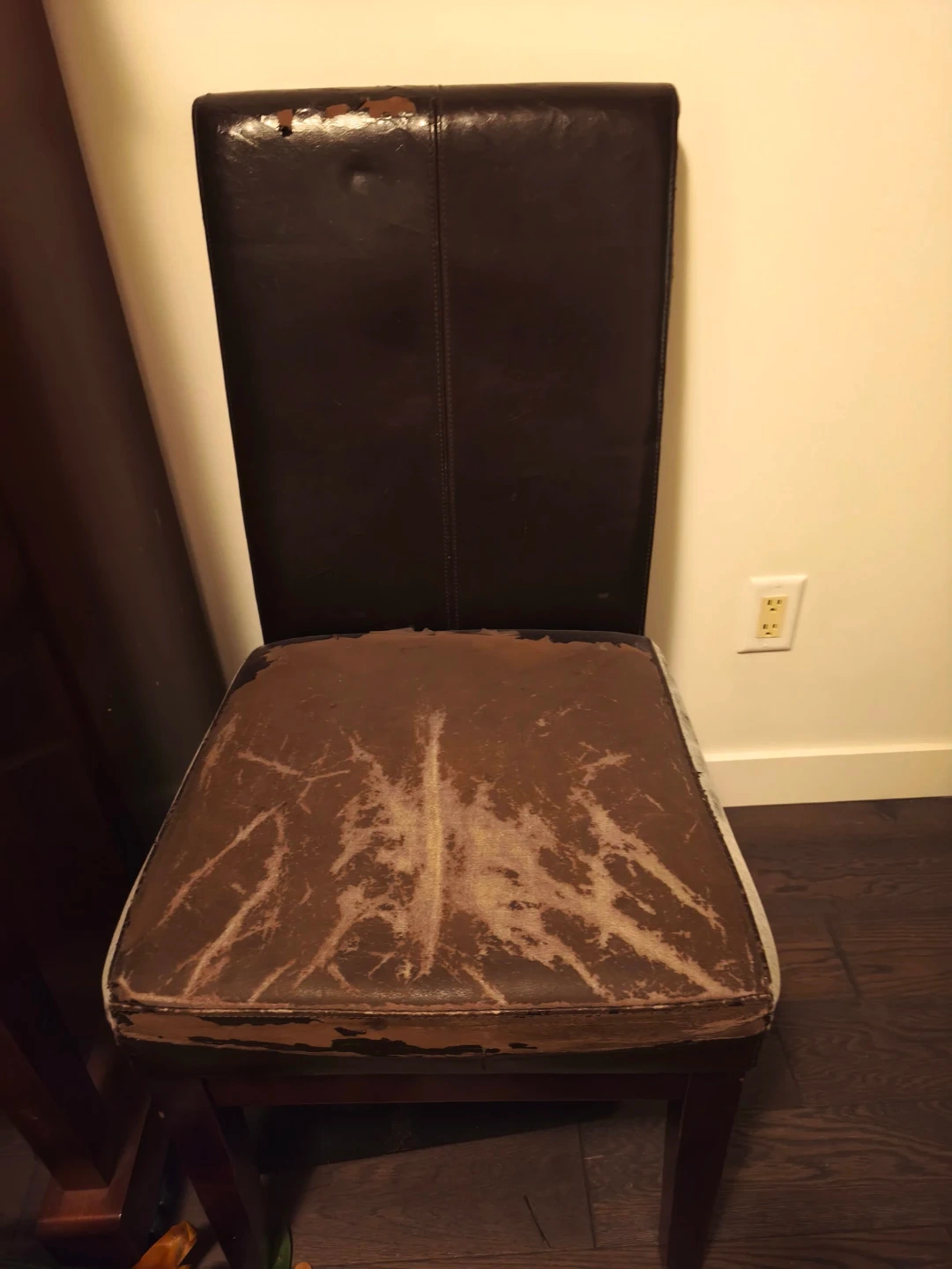 This is a brown dining chair with faux leather upholstery. It shows significant wear on the seat and top of the backrest. The frame is made of wood.