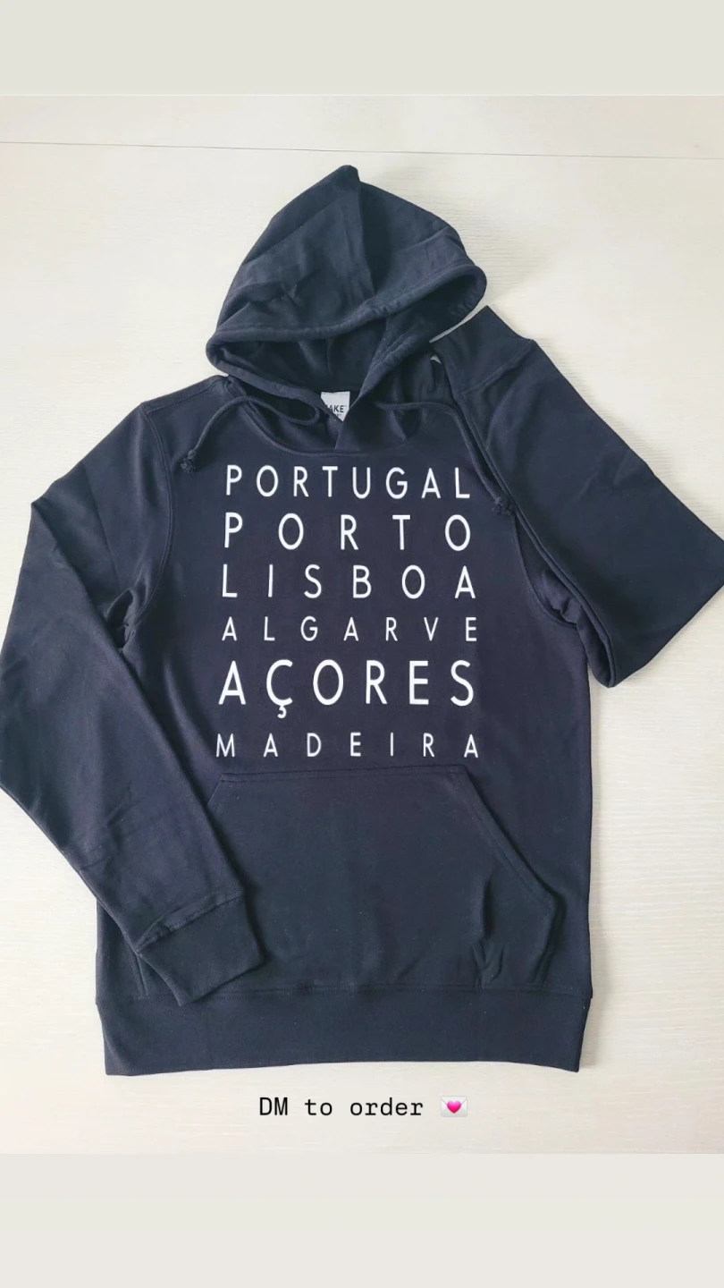 This black hoodie features a graphic print with various Portuguese locations like Porto, Lisbon, Algarve, Açores, and Madeira. It's a comfortable pullover style with a front pocket and a hood.