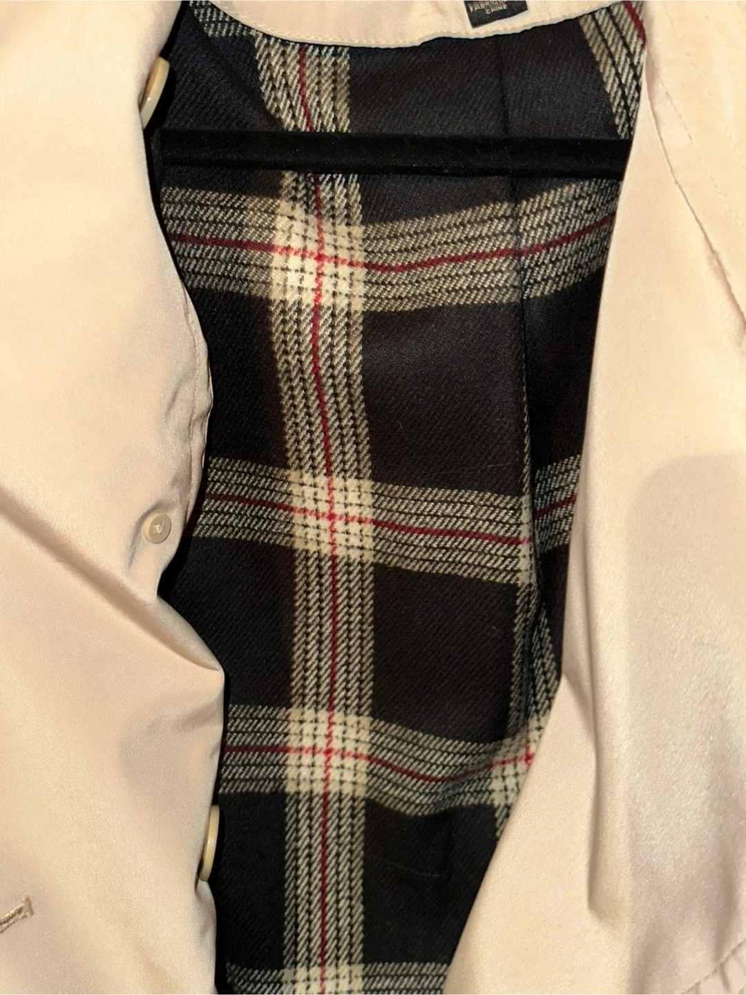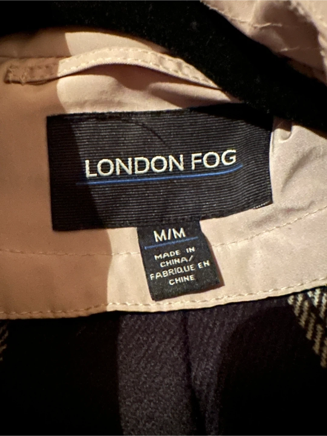 This classic London Fog trench coat is a stylish outerwear option. It features a plaid lining and a double-breasted closure. Size is medium/medium.