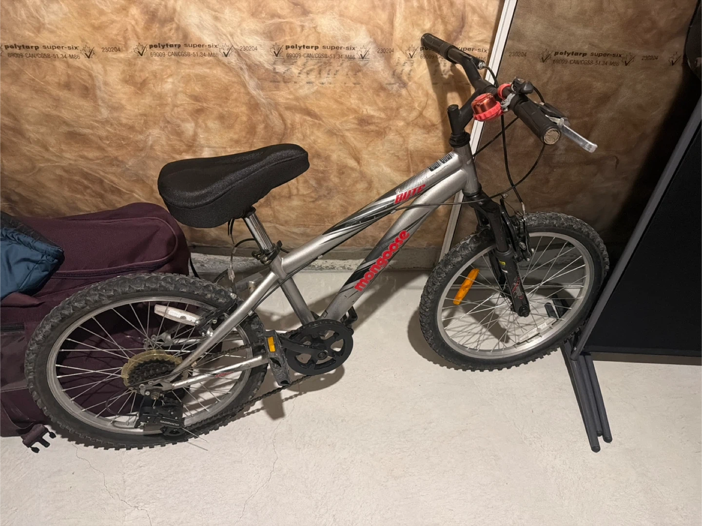 This is a Mongoose kids' bike with 20-inch wheels. It's silver in colour and has a front suspension fork. A red bell is attached to the handlebars.