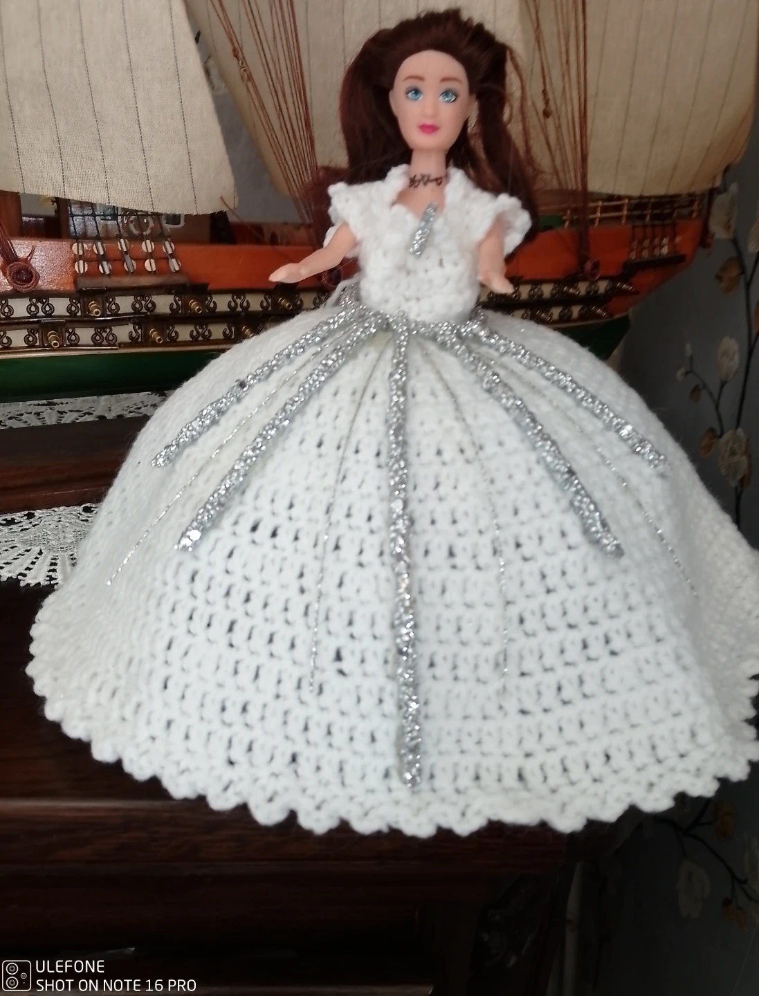 This is a handmade crocheted doll dress in white, featuring silver sparkle accents. It's designed to fit a standard fashion doll. This dress is perfect for playtime or display! Suitable as night light
