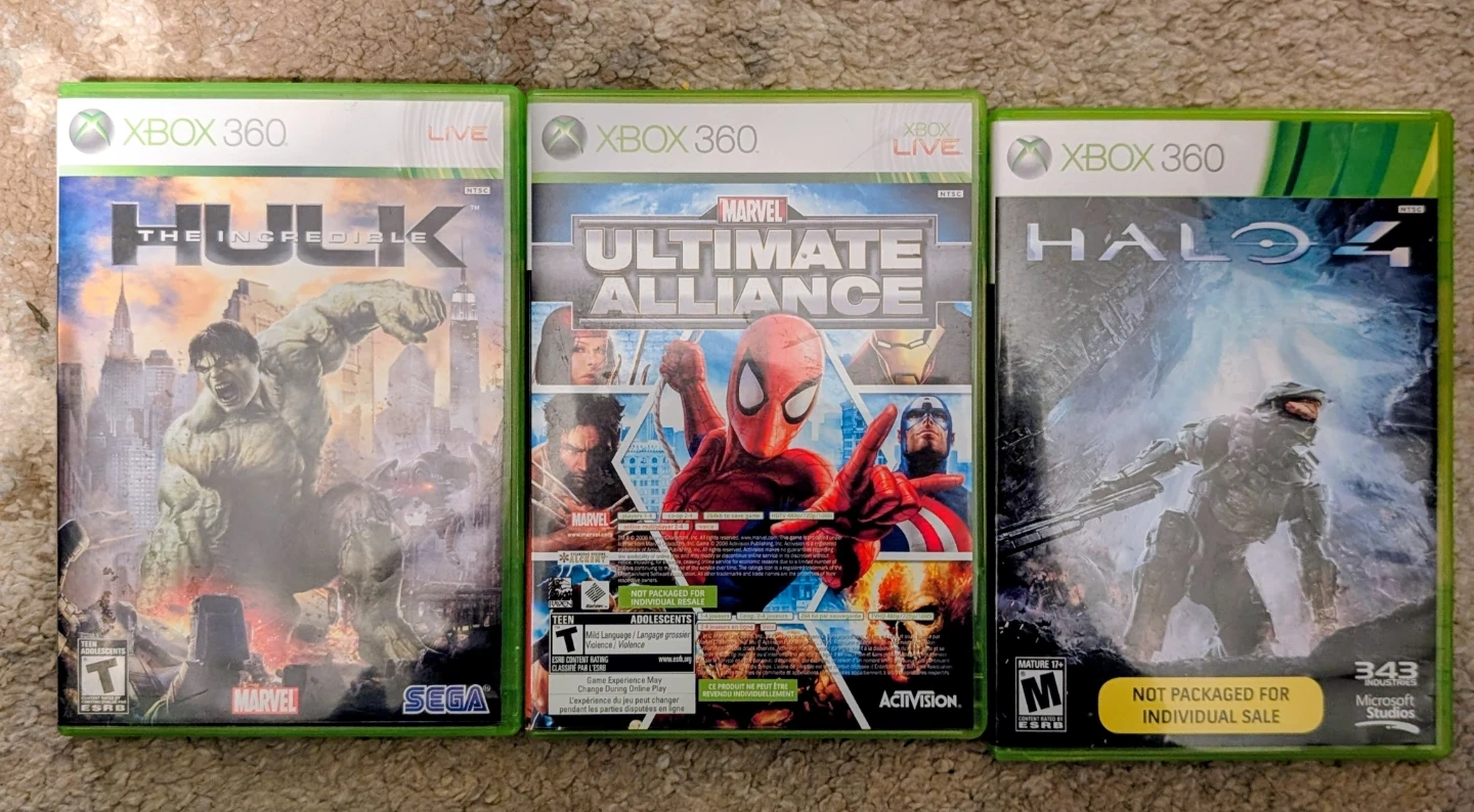 Bundle of three Xbox 360 video games. Includes The Incredible Hulk, Marvel Ultimate Alliance, and Halo 4. All games are rated Teen or Mature.