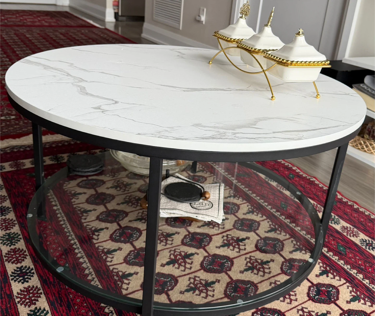 Round coffee table featuring a white marble-look top and a black metal frame. It has a convenient glass shelf on the bottom for extra storage. It's a stylish addition to any living room!