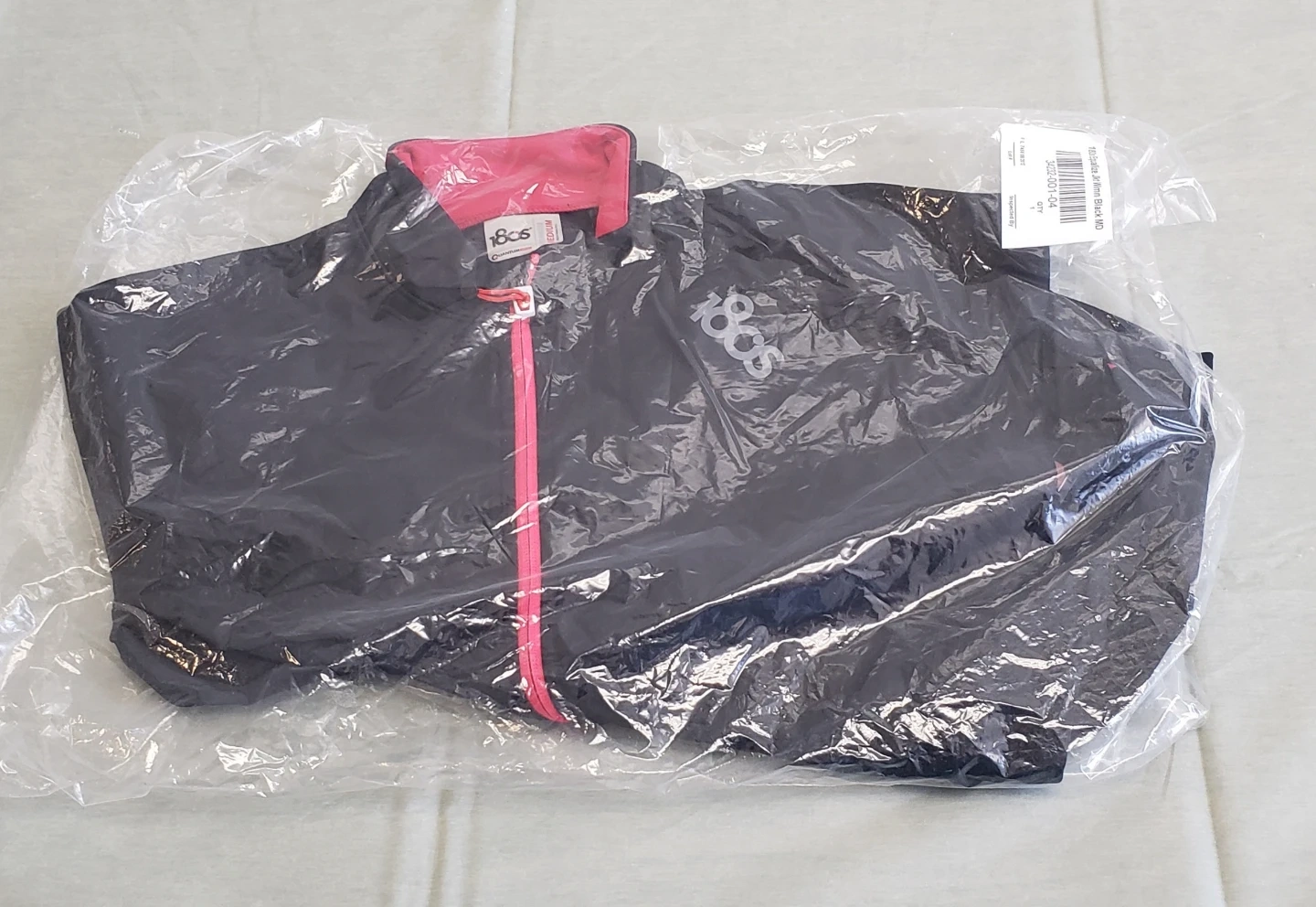 This is a black 180s jacket in size Ladies medium. It features a full zip front and pink accents on the collar, cuffs, and zipper pulls. Two zippered hand pockets are also present. Brand new, cash only pickup in Queens NY