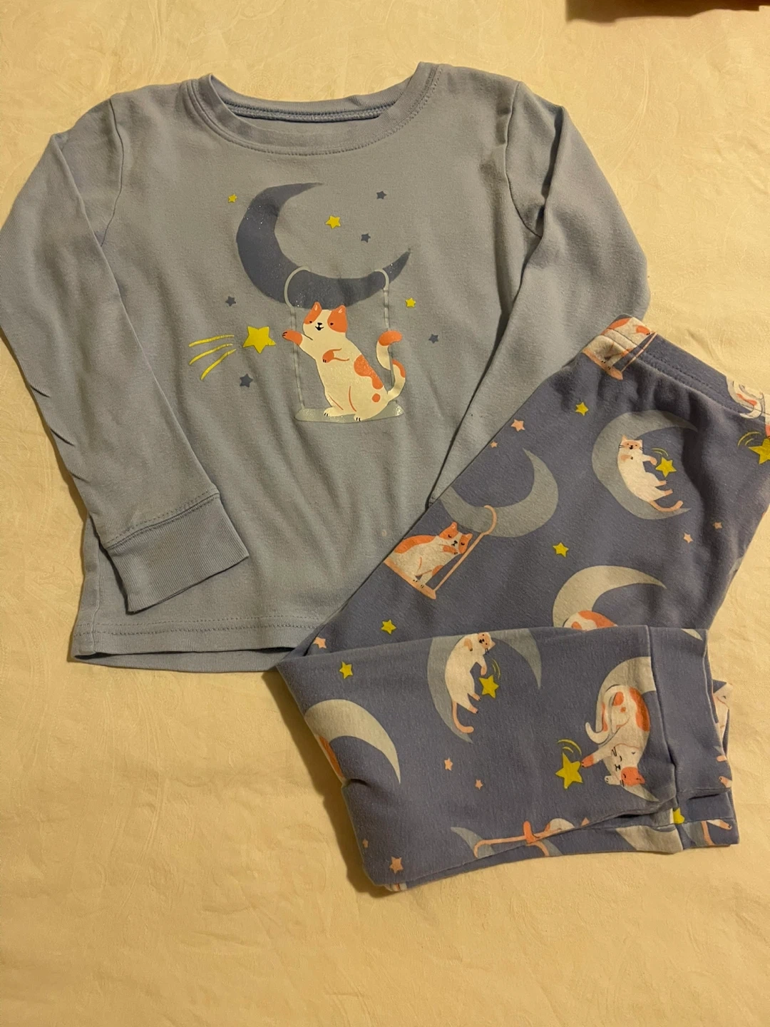 Cute cat and moon themed pajamas! The top is a light blue colour and the bottoms are a darker blue with the same cat and moon pattern. Good used condition. Well loved !