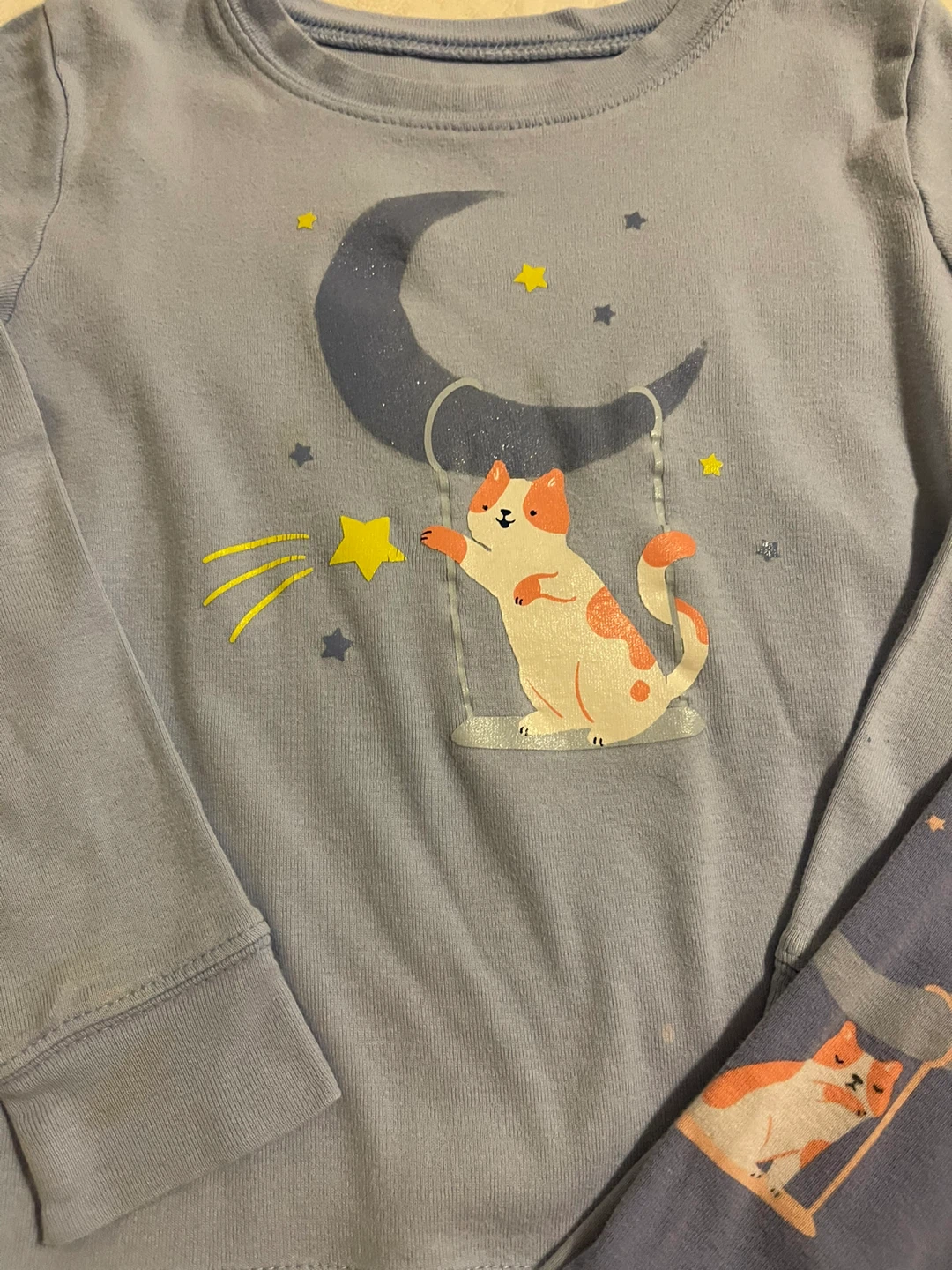 Cute cat and moon themed pajamas! The top is a light blue colour and the bottoms are a darker blue with the same cat and moon pattern. Good used condition. Well loved !